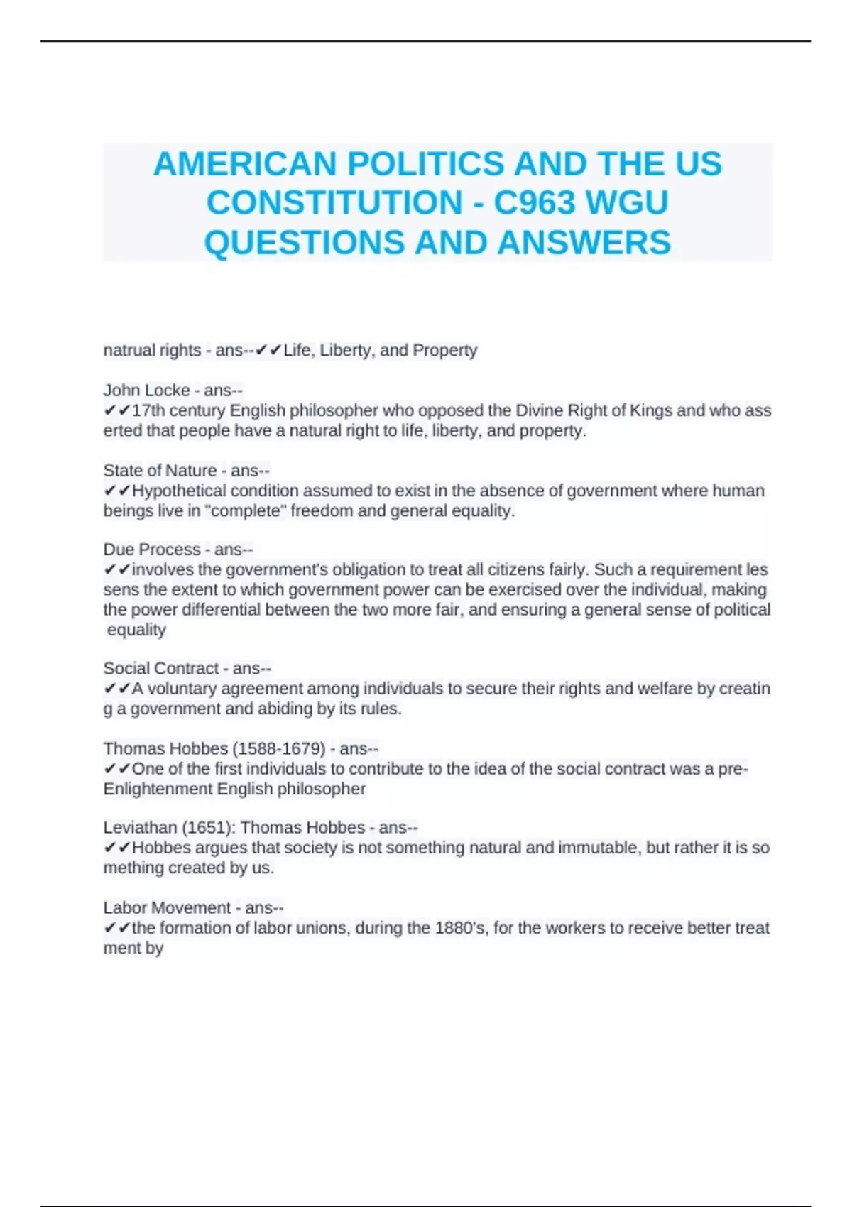 AMERICAN POLITICS AND THE US CONSTITUTION - C963 WGU QUESTIONS AND ANSWERS