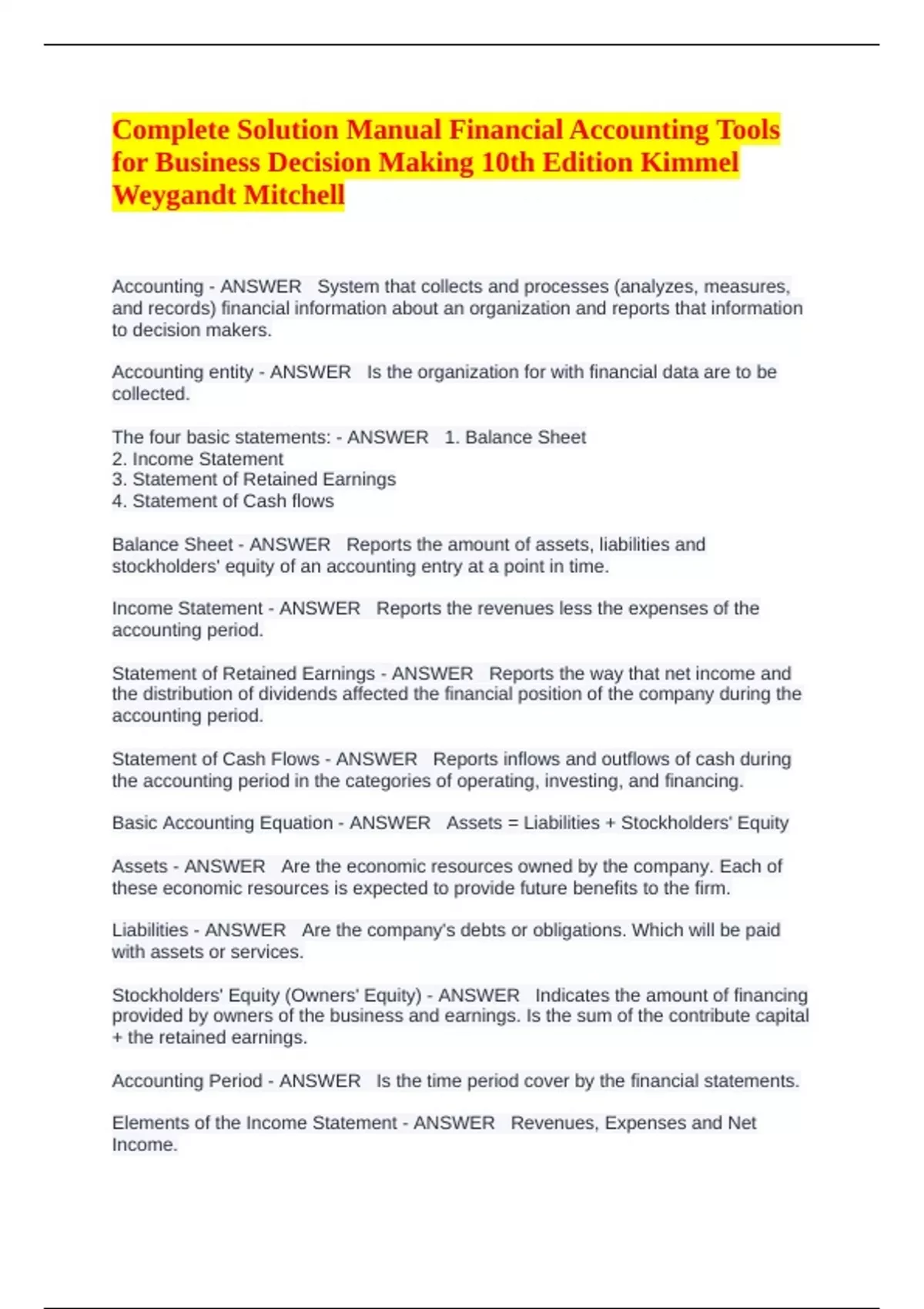 Complete Solution Manual Financial Accounting Tools for Business Decision Making 10th Edition Kimmel Weygandt Mitchell