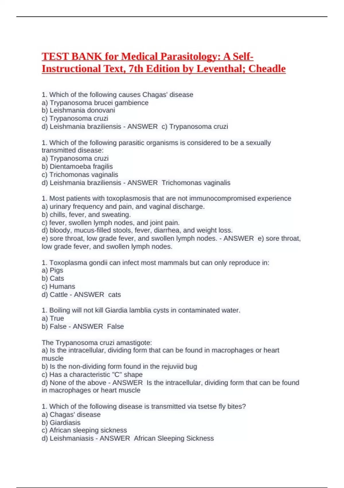 d) Leishmaniasis - ANSWER African Sleeping Sickness