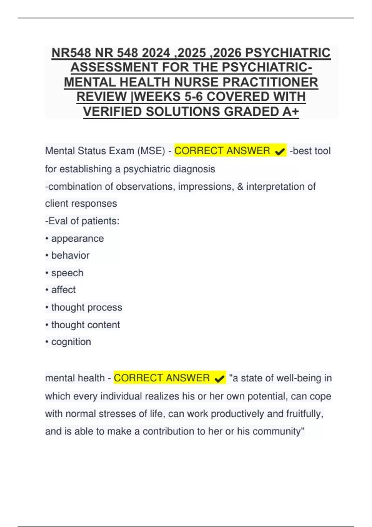 NR548 NR 548 2024 ,2025 ,2026 PSYCHIATRIC ASSESSMENT FOR THE PSYCHIATRICMENTAL HEALTH NURSE PRACTITIONER REVIEW |WEEKS 5-6 COVERED WITH VERIFIED SOLUTIONS GRADED A+