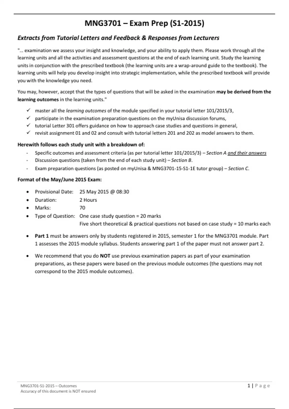 MNG3701-S1-2015 – Outcomes 1|P a ge