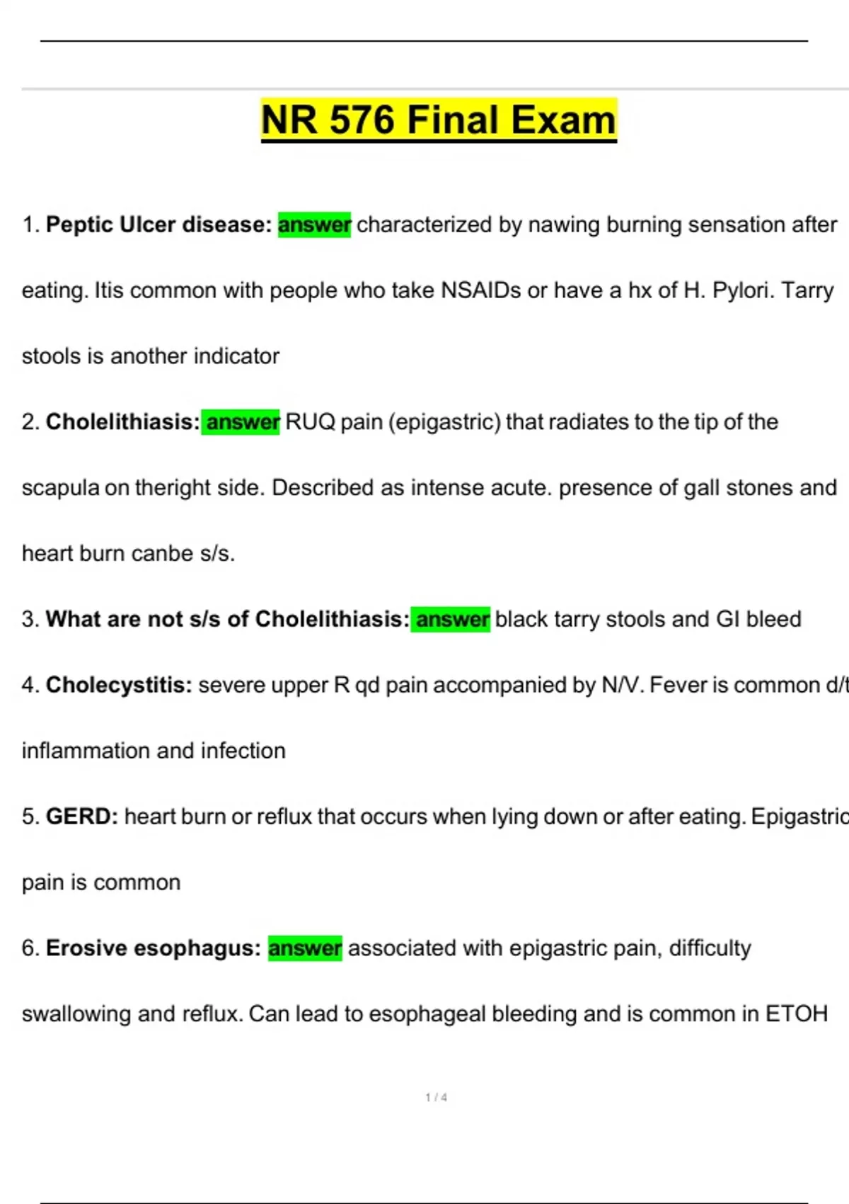 1. Peptic Ulcer disease: answer characterized by nawing burning sensation after