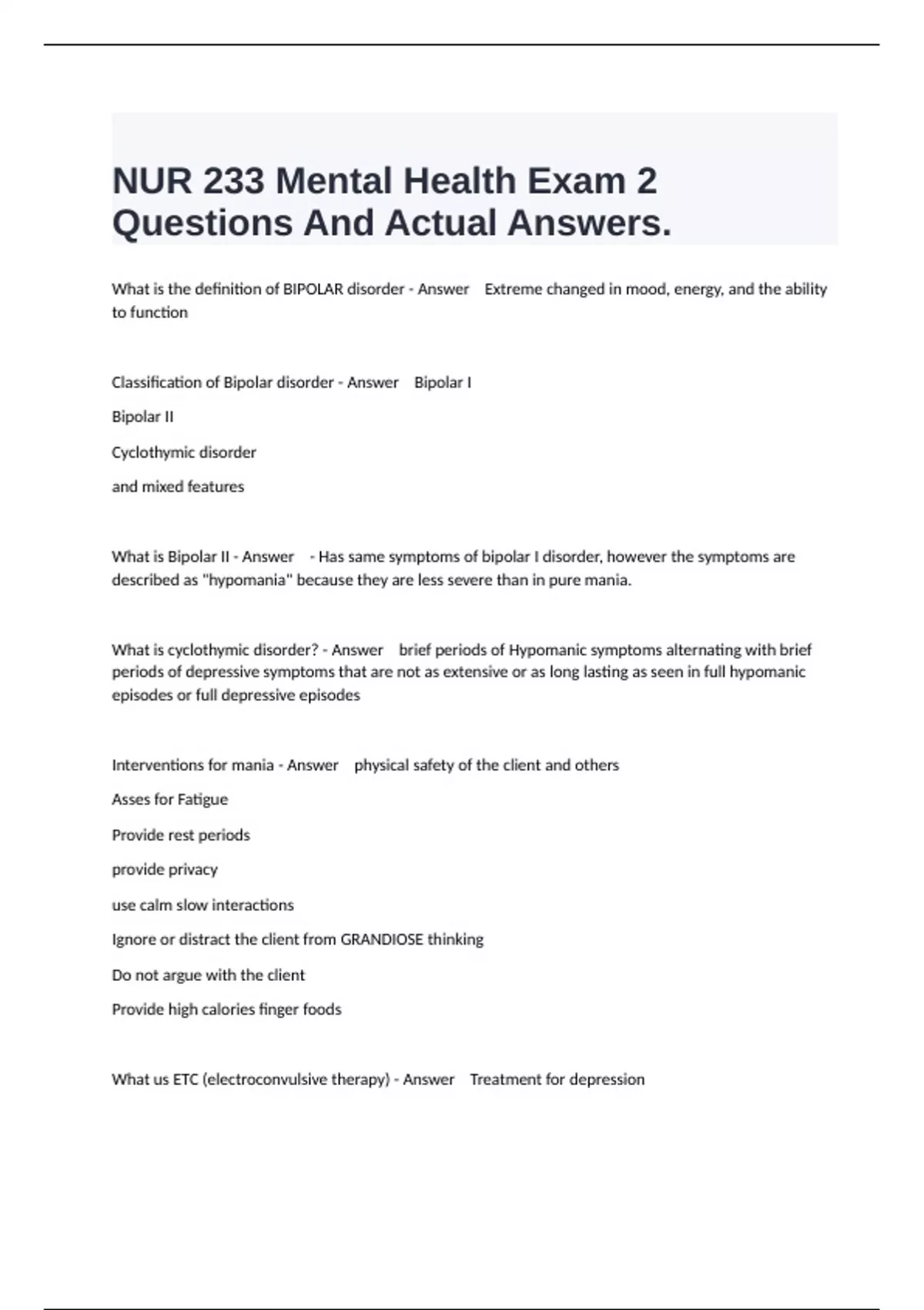 Interventions for mania - Answer physical safety of the client and others