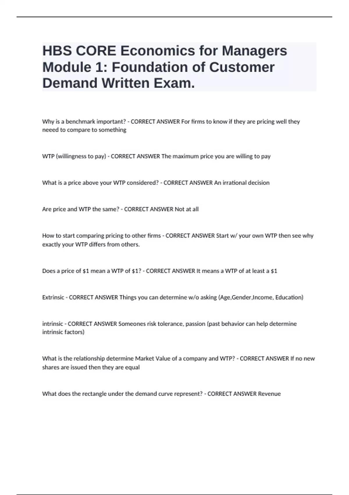HBS CORE Economics for Managers Module 1: Foundation of Customer Demand Written Exam. Why is a benchmark important? - CORRECT ANSWER For firms to know if they are pricing well they neeed to compare to something WTP (willingness to pay) - CORRECT ANSWER The maximum price you are willing to pay What is a price above your WTP considered? - CORRECT ANSWER An irrational decision Are price and WTP the same? - CORRECT ANSWER Not at all How to start comparing pricing to other firms - CORRECT ANSWER Start w/ your own WTP then see why exactly your WTP differs from others. Does a price of $1 mean a WTP of $1? - CORRECT ANSWER It means a WTP of at least a $1 Extrinsic - CORRECT ANSWER Things you can determine w/o asking (Age,Gender,Income, Education) intrinsic - CORRECT ANSWER Someones risk tolerance, passion (past behavior can help determine intrinsic factors) What is the relationship determine Market Value of a company and WTP? - CORRECT ANSWER If no new shares are issued then they are equal