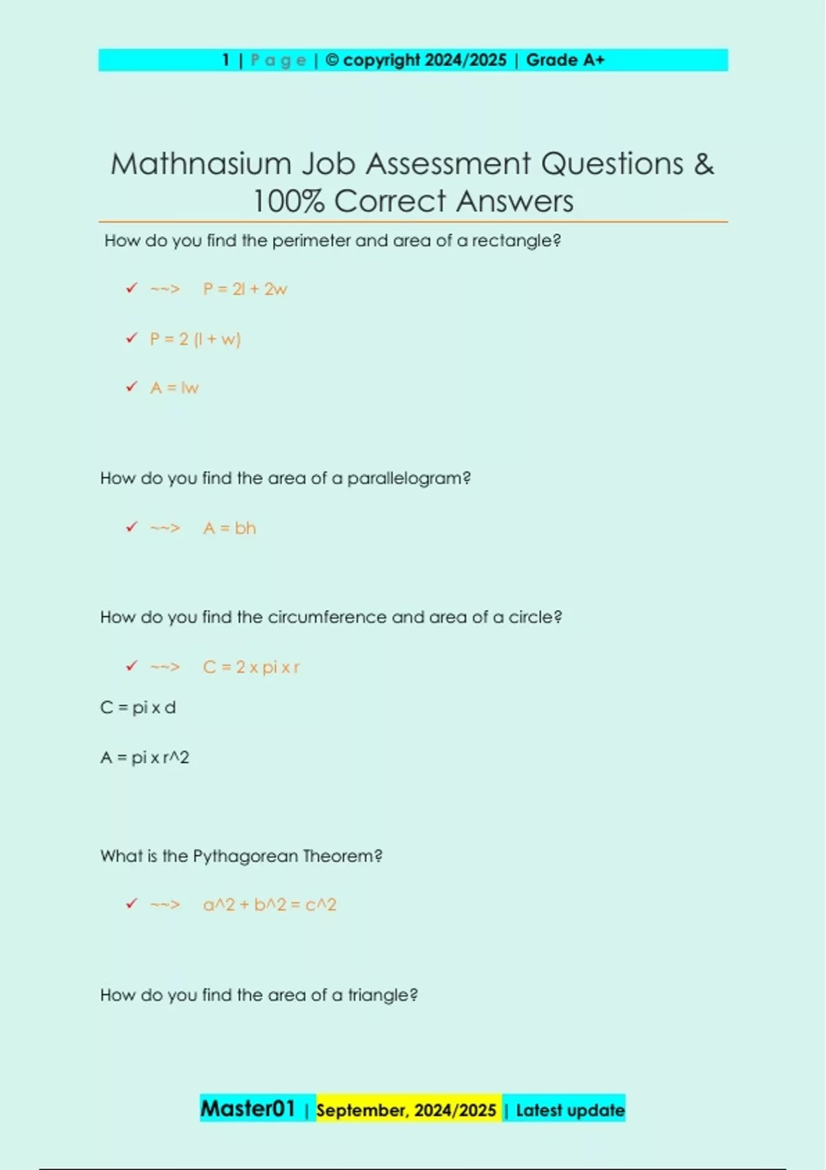 How do you find the perimeter and area of a rectangle? ~~> P = 2l + 2w P = 2 (l + w) A = lw How do you find the area of a parallelogram? ~~> A = bh How do you find the circumference and area of a circle? ~~> C = 2 x pi x r C = pi x d A = pi x r^2 What is the Pythagorean Theorem? ~~> a^2 + b^2 = c^2 How do you find the area of a triangle? 2 | P a g e | © copyright 2024/2025 | Grade A+ Master01 | September, 2024/2025 | Latest update ~~> A = (1/2)bh How do you find the area of a trapezoid? ~~> A = (1/2)h (b1 + b2) How do you find the volume and surface area of a rectangular solid? ~~> V = lwh SA = 2lw + 2lh + hw How do you find the volume of a cylinder? ~~> V = pi x r^2 x h How do you find the volume of a cone? ~~> V = (1/3) x pi x r^2 xh How do you find the volume of a square pyramid? ~~> V = (1/3) x (area of base) x height How do you find the volume of a sphere? ~~> V = (4/3) x pi x r^3 3 | P a g e | © copyright 2024/2025 | Grade A+ Master01 | September, 2024/2025 | Latest update How many liters are in 1 quart? ~~> 1 quart = 0.95 liters How many centimeters are there in an inch? ~~> 1 inch = 2.54 centimeters How many kilograms are in a pound? ~~> 1 pound = 0.45 kilograms How do you convert Celsius to Fahrenheit? ~~> F = (9/5)C + 3