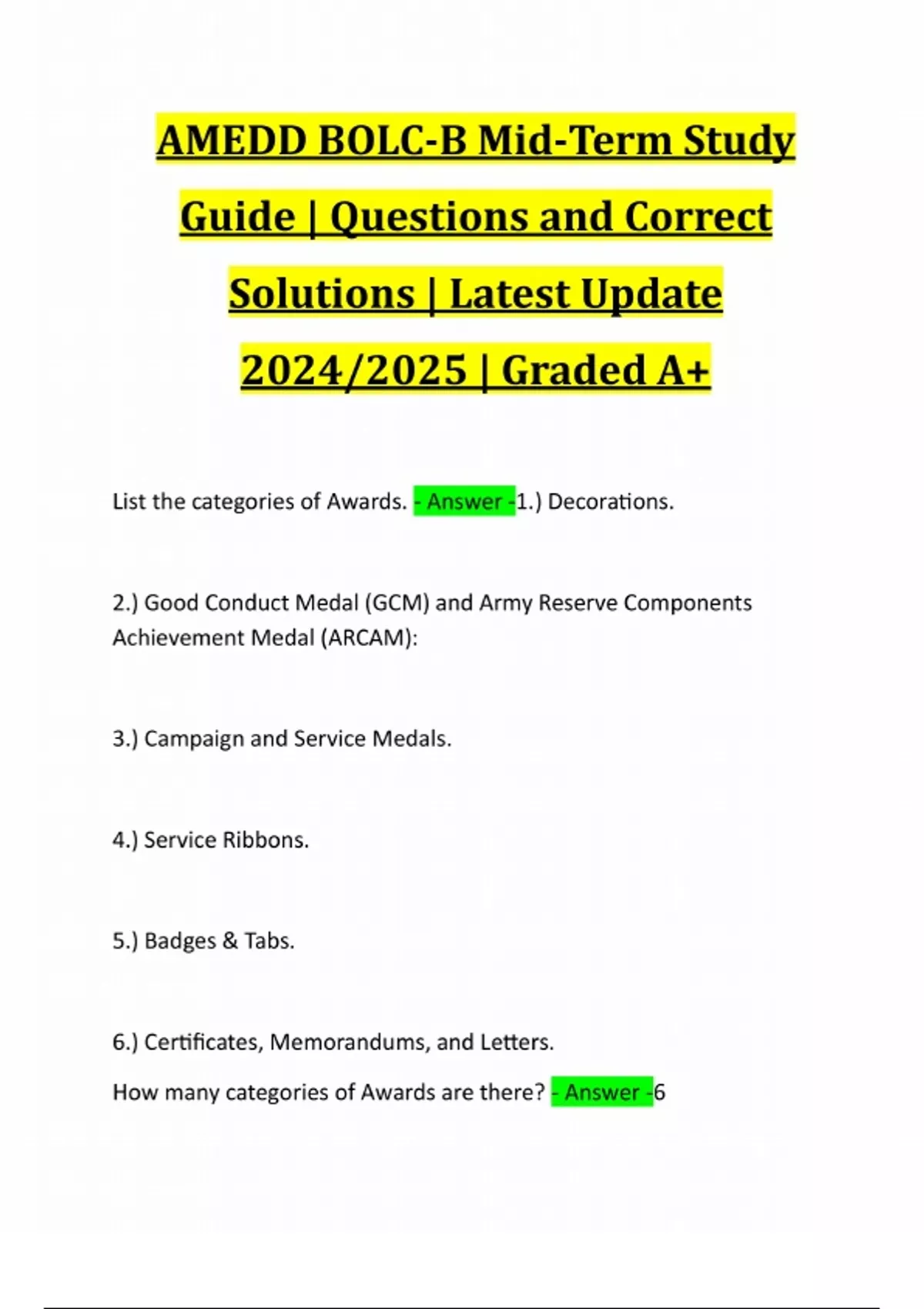 AMEDD BOLC-B Mid-Term Study Guide | Questions and Correct Solutions | Latest Update 2024/2025 | Graded A+ List the categories of Awards. - Answer -1.) Decorations. 2.) Good Conduct Medal (GCM) and Army Reserve Components Achievement Medal (ARCAM): 3.) Campaign and Service Medals. 4.) Service Ribbons. 5.) Badges & Tabs. 6.) Certificates, Memorandums, and Letters. How many categories of Awards are there? - Answer -6List the functions of the Personnel Administration Center. - Answer -1.) Process Personnel Actions. 2.) Provide notification of annual records review. 3.) Assist with survivor benefit plan