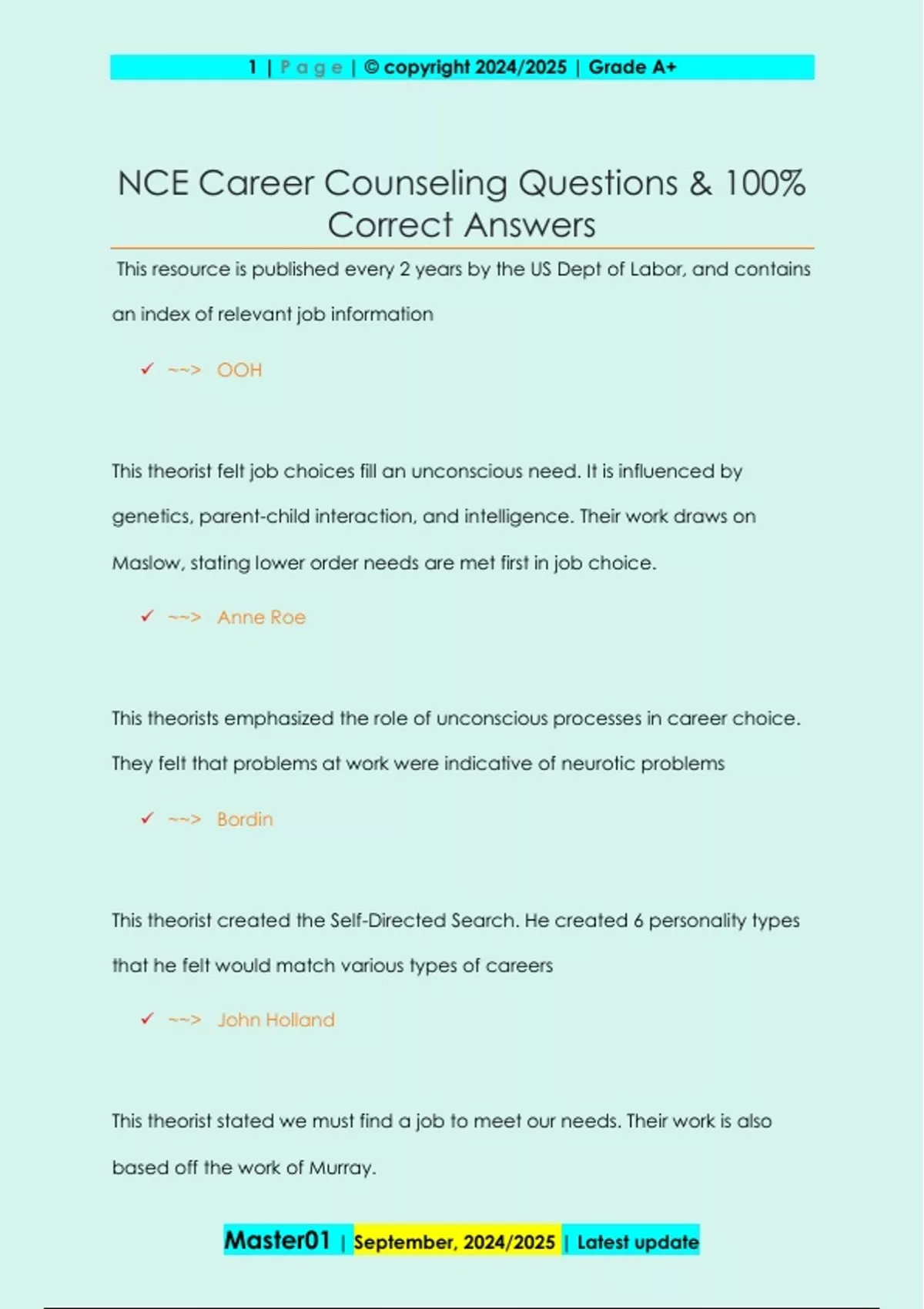This resource is published every 2 years by the US Dept of Labor, and contains an index of relevant job information ~~> OOH This theorist felt job choices fill an unconscious need. It is influenced by genetics, parent-child interaction, and intelligence. Their work draws on Maslow, stating lower order needs are met first in job choice. ~~> Anne Roe This theorists emphasized the role of unconscious processes in career choice. They felt that problems at work were indicative of neurotic problems ~~> Bordin This theorist created the Self-Directed Search. He created 6 personality types that he felt would match various types of careers ~~> John Holland This theorist stated we must find a job to meet our needs. Their work is also based off the work of Murray. 2 | P a g e | © copyright 2024/2025 | Grade A+ Master01 | September, 2024/2025 | Latest update ~~> Hoppock This theory was created by Williamson and Parsons. It states that the worker's traits must match the requirements of their job. The theory is grounded in Differential Psychology ~~> Trait and Factor Theory Considered the father of Vocational Guidance and known for work on Trait and Factor Theory. ~~> Frank Parsons They are known for their work on the Trait and Factor Theory, and is considered the spokesperson for the so-called "minnesota viewpoint" ~~> Williamson This theorists created the "needs press" theory. They felt the occupation was used to meet the worker's needs. They also created the TAT. ~~> Henry Murray This theorist drew upon psychoanalytic theory, and is known for their work with Roe. They often emphasized the role of sublimination. 3 | P a g e | © copyright 2024/2025 | Grade A+ Master01 | September, 2024/2025 | Latest update ~~> Brill These theorists created a decision making model - stated we first imagine ourselves in a job (anticipation), and then engage in reality testing of pursing it (implementation) ~~> Tiedman & O'hara This person is known for their research on career maturity ~~> Crites