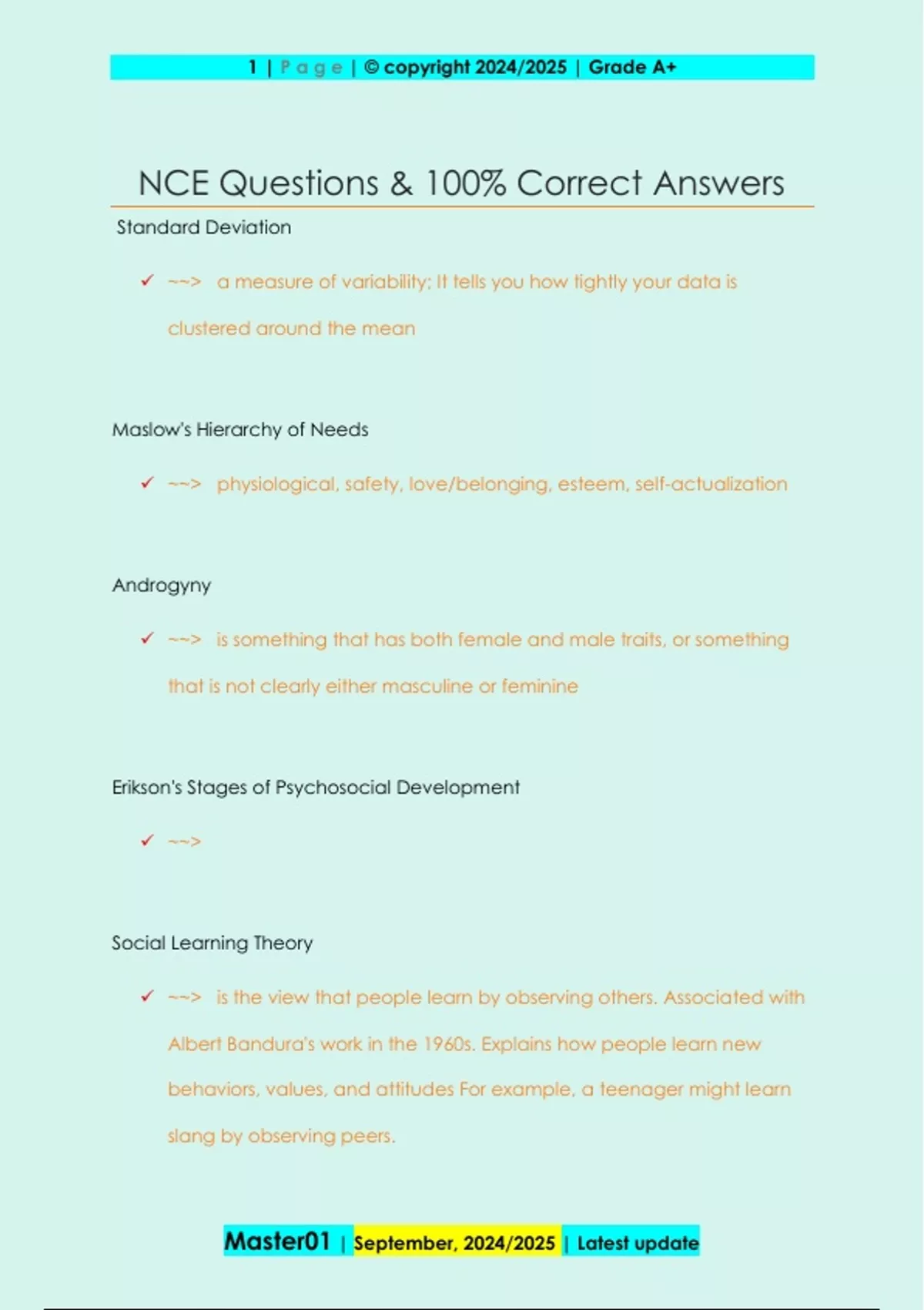 Standard Deviation ~~> a measure of variability; It tells you how tightly your data is clustered around the mean Maslow's Hierarchy of Needs ~~> physiological, safety, love/belonging, esteem, self-actualization Androgyny ~~> is something that has both female and male traits, or something that is not clearly either masculine or feminine Erikson's Stages of Psychosocial Development ~~> Social Learning Theory ~~> is the view that people learn by observing others. Associated with Albert Bandura's work in the 1960s. Explains how people learn new behaviors, values, and attitudes For example, a teenager might learn slang by observing peers. 2 | P a g e | © copyright 2024/2025 | Grade A+ Master01 | September, 2024/2025 | Latest update Core features of depression ~~> diminished interest or pleasure Core features of bipolar disorders ~~> mania; hypomania Hypomania ~~> abnormally, persistently elevated mood, expansive mood, irritable mood Difference between mania and hypomania ~~> mania lasts more than 1 week and hypomania lasts 4 days Key features of schizophrenia and psychotic disorders ~~> delusions, hallucinations, disorganized thinking, grossly disorganized or abnormal motor behavior, negative symptoms Symptoms of PTSD ~~> Re-experiencing the trauma through flashbacks, nightmares, and intrusive thoughts 3 | P a g e | © copyright 2024/2025 | Grade A+ Master01 | September, 2024/2025 | Latest update Five Factor Model of Personality ~~> O- openness vs. tradition/convention C- conscientiousness vs. negligence E- extraversion vs. introversion A- agreeableness vs. antagonistic N- neuroticism vs. emotional stability 3 P's of personality disorder ~~> -Persistent (over time) -Pervasive (across situations) -Pathological (clearly abnormal) Cluster A personality dis