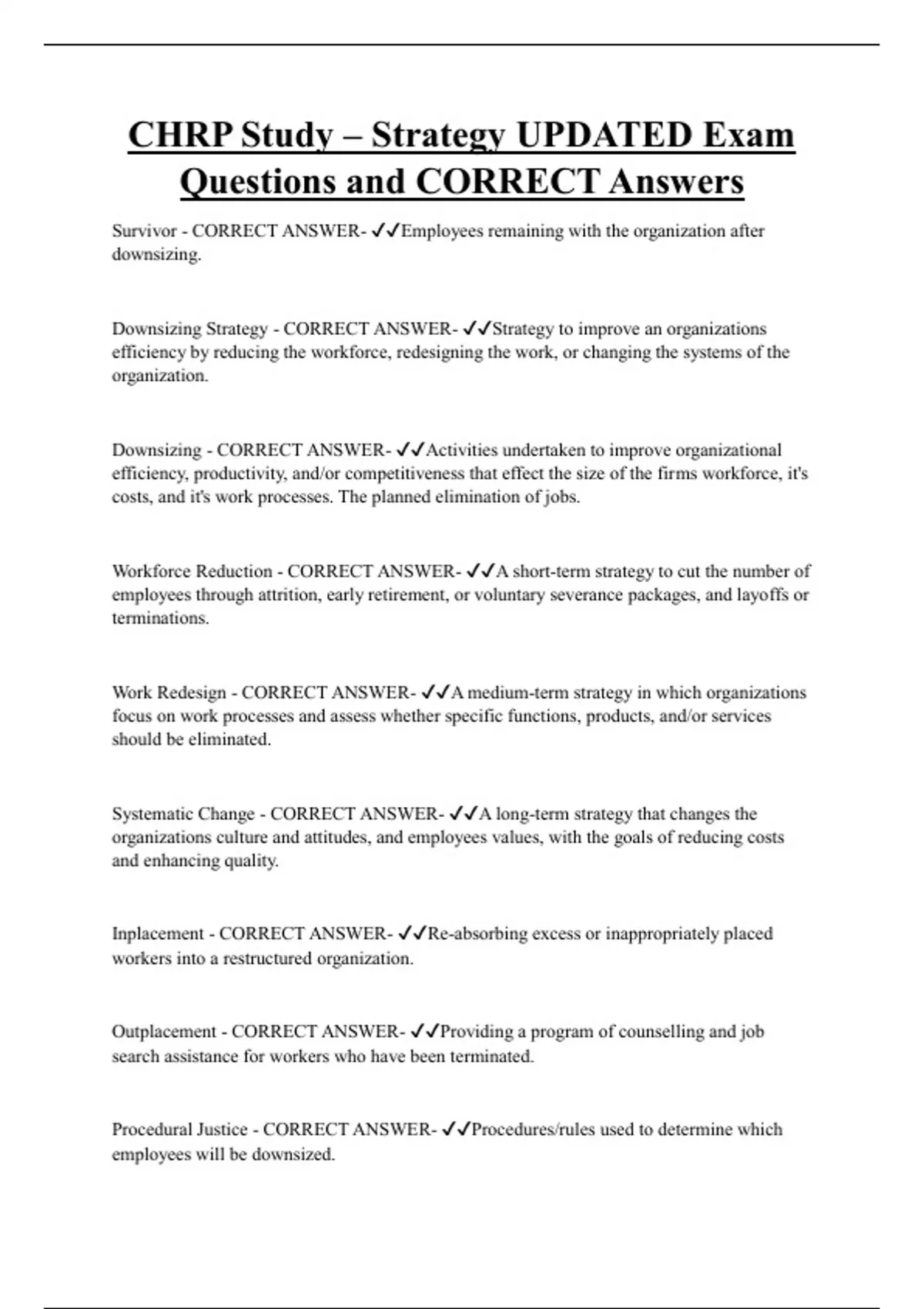Workforce Reduction - CORRECT ANSWER- ✔✔A short-term strategy to cut the number of