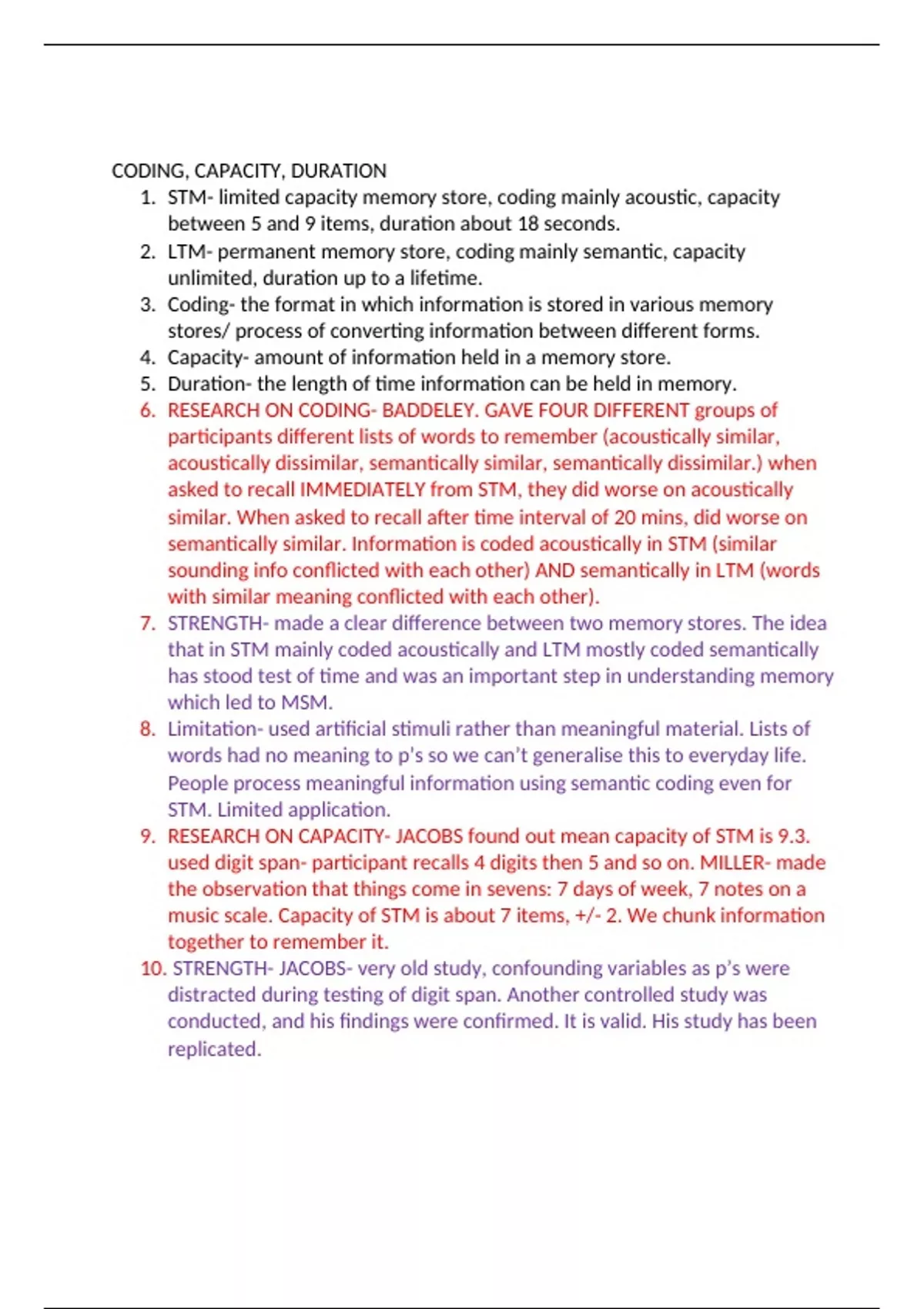 Summary AQA A LEVEL PSYCHOLOGY MEMORY TOPIC NOTES- ACHIEVED AN A* WITH THESE NOTES