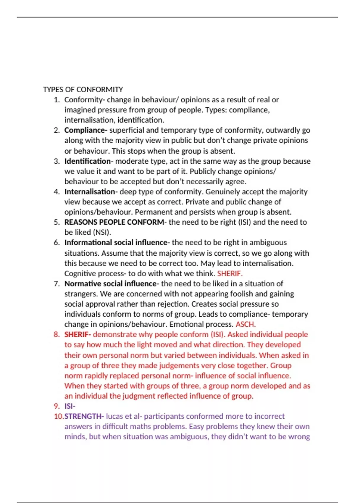 Summary AQA A LEVEL PSYCHOLOGY SOCIAL INFLUENCE TOPIC NOTES- ACHIEVED AN A* WITH THESE NOTES.