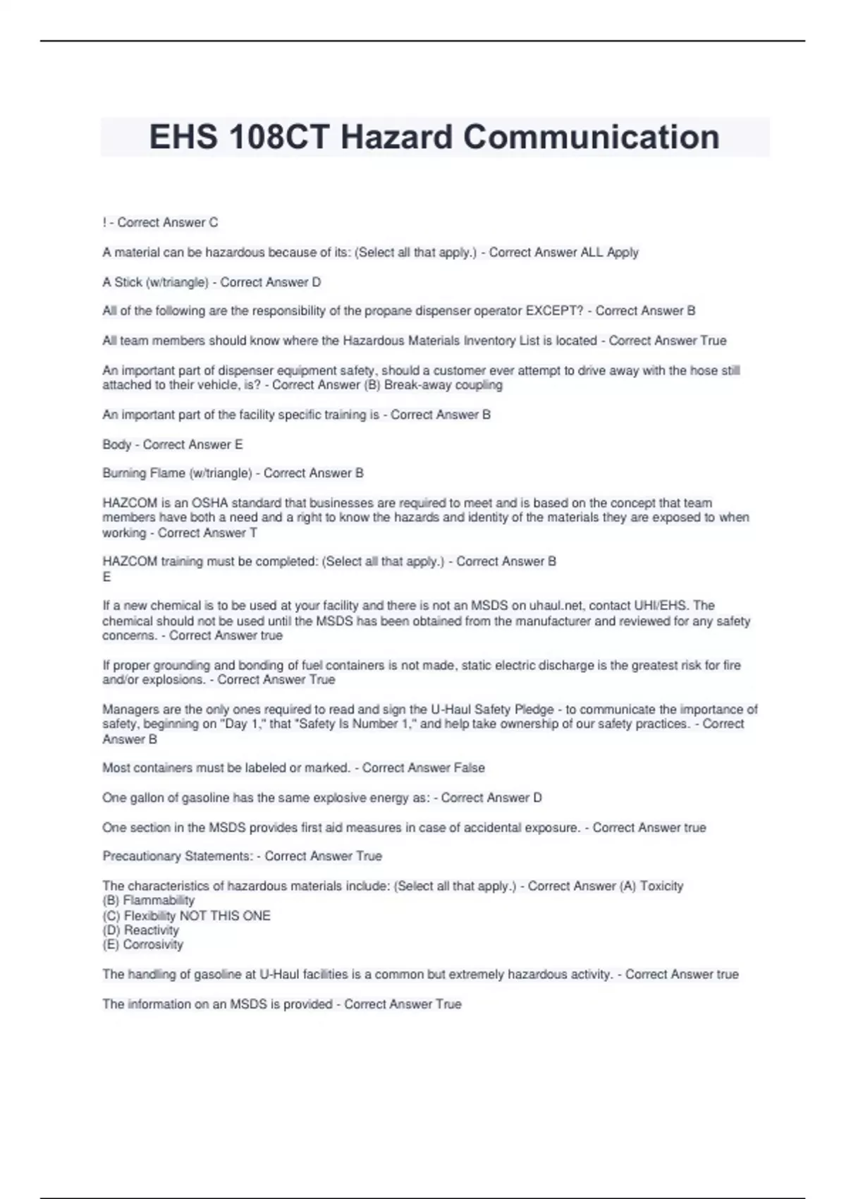 ! - Correct Answer C A material can be hazardous because of its: (Select all that apply.) - Correct Answer ALL Apply A Stick (w/triangle) - Correct Answer D All of the following are the responsibility of the propane dispenser operator EXCEPT? - Correct Answer B All team members should know where the Hazardous Materials Inventory List is located - Correct Answer True An important part of dispenser equipment safety, should a customer ever attempt to drive away with the hose still attached to their vehicle, is? - Correct Answer (B) Break-away coupling An important part of the facility specific training is - Correct Answer B Body - Correct Answer E Burning Flame (w/triangle) - Correct Answer B HAZCOM is an OSHA standard that businesses are required to meet and is based on the concept that team members have both a need and a right to know the hazards and identity of the materials they are exposed to when working - Correct Answer T HAZCOM training must be completed: (Select all that apply.) - Correct Answer B E If a new chemical is to be used at your facility and there is not an MSDS on , contact UHI/EHS. The chemical should not be used until the MSDS has been obtained from the manufacturer and reviewed for any safety concerns. - Correct Answer true If proper grounding and bonding of fuel containers is not made, static electric discharge is the greatest risk for fire and/or explosions. - Correct Answer True Managers are the only ones required to read and sign the U-Haul Safety Pledge - to communicate the importance of safety, beginning on "Day 1," that "Safety Is Number 1," and help take ownership of our safety practices. - Correct Answer B Most containers must be labeled or marked. - Correct Answer False One gallon of gasoline has the same explosive energy as: - Correct Answer D One section in the MSDS provides first aid measures in case of accidental exposure. - Correct Answer true Precautionary Statements: - Correct Answer True The characteristics of hazardous materials include: (Select all that apply.) - Correct Answer (A) Toxicity (B) Flammability (C) Flexibility NOT THIS ONE
