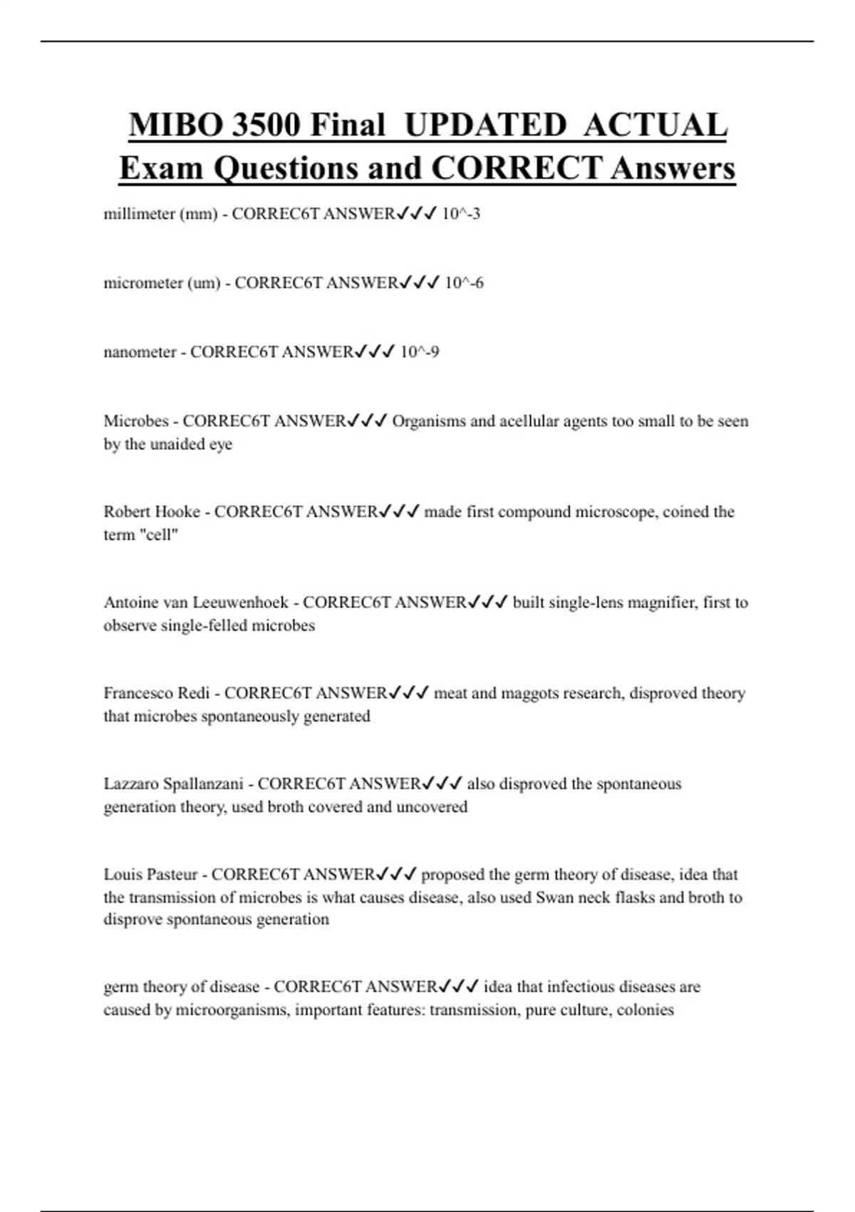 MIBO 3500 Final UPDATED ACTUAL Exam Questions and CORRECT Answers millimeter (mm) - CORREC6T ANSWER 10^-3 micrometer (um) - CORREC6T ANSWER 10^-6 nanometer - CORREC6T ANSWER 10^-9 Microbes - CORREC6T ANSWER Organisms and acellular agents too small to be seen by the unaided eye