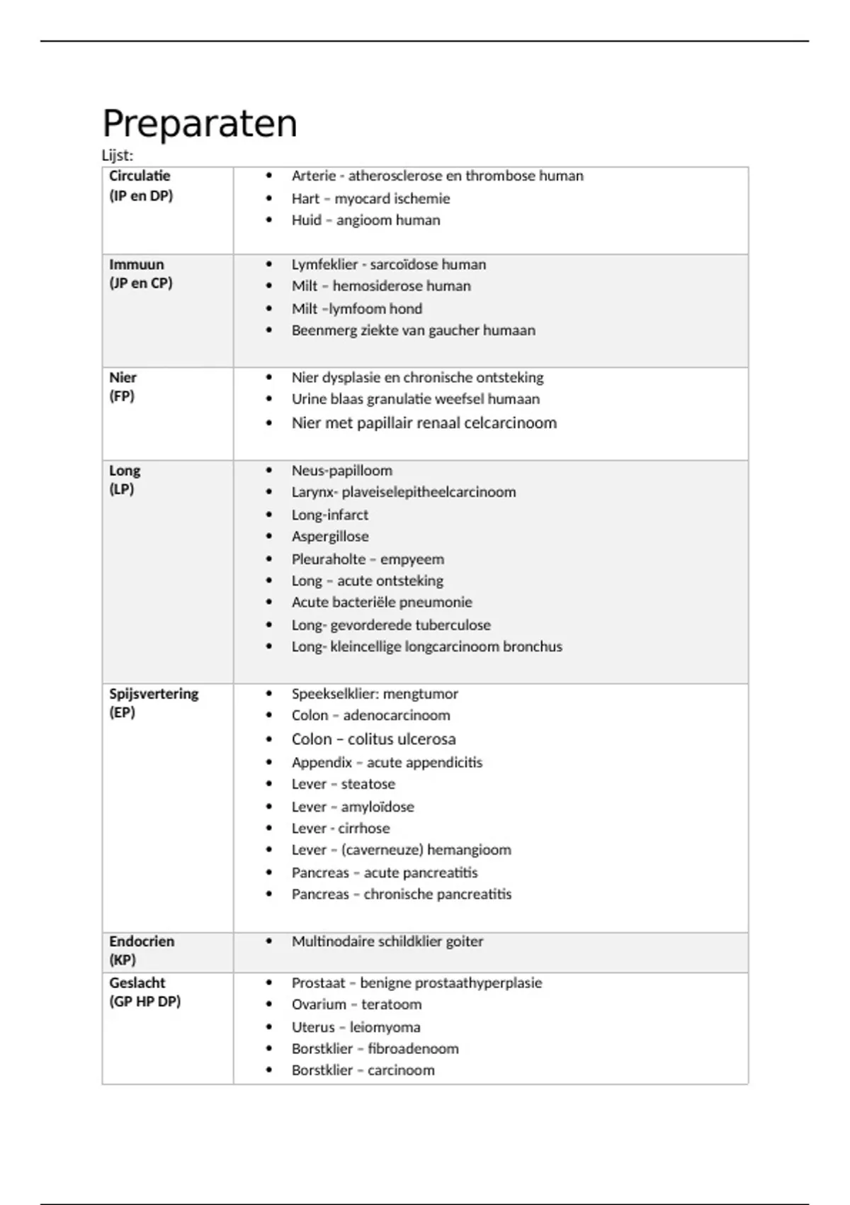 Er wordt een overzicht gegeven van de preparaten van histopathologie. Per preparaat is in bullet points samen gevat wat je erover moet zeggen op het examen. De foto's heb ik uit het document moeten halen om te kunnen uploaden (je krijgt deze op blackboard wanneer alle practica afgerond zijn). Ikj behaalde een 18/20 voor dit vak.