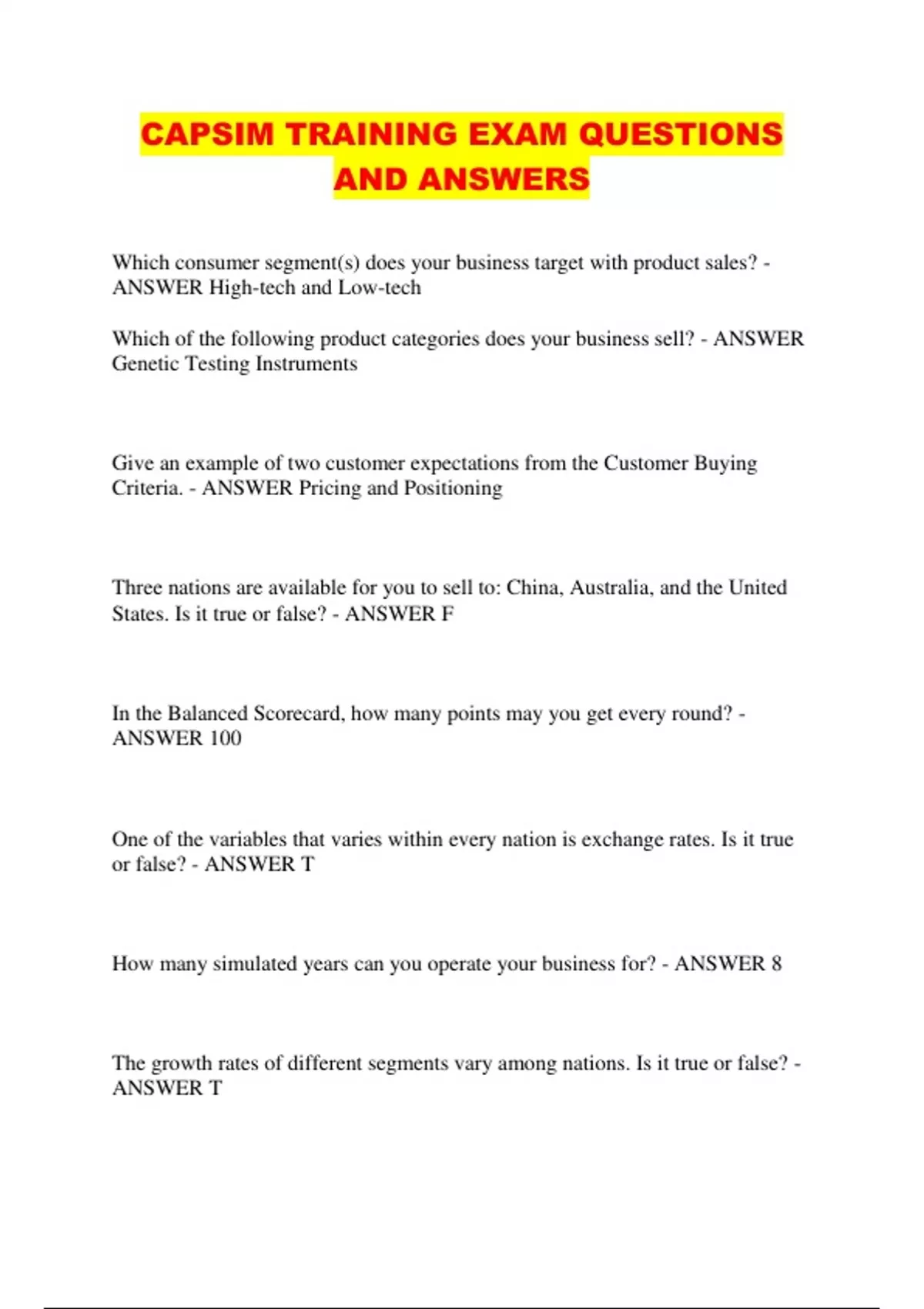 CAPSIM TRAINING EXAM QUESTIONS