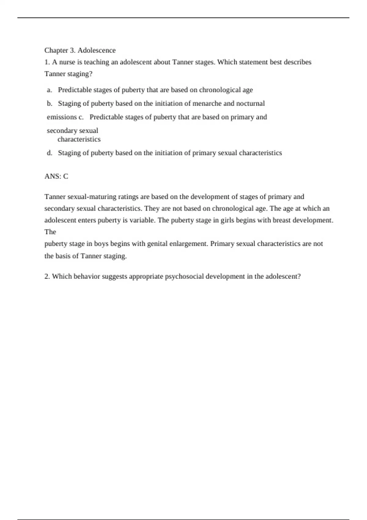1. A nurse is teaching an adolescent about Tanner stages. Which statement best describes