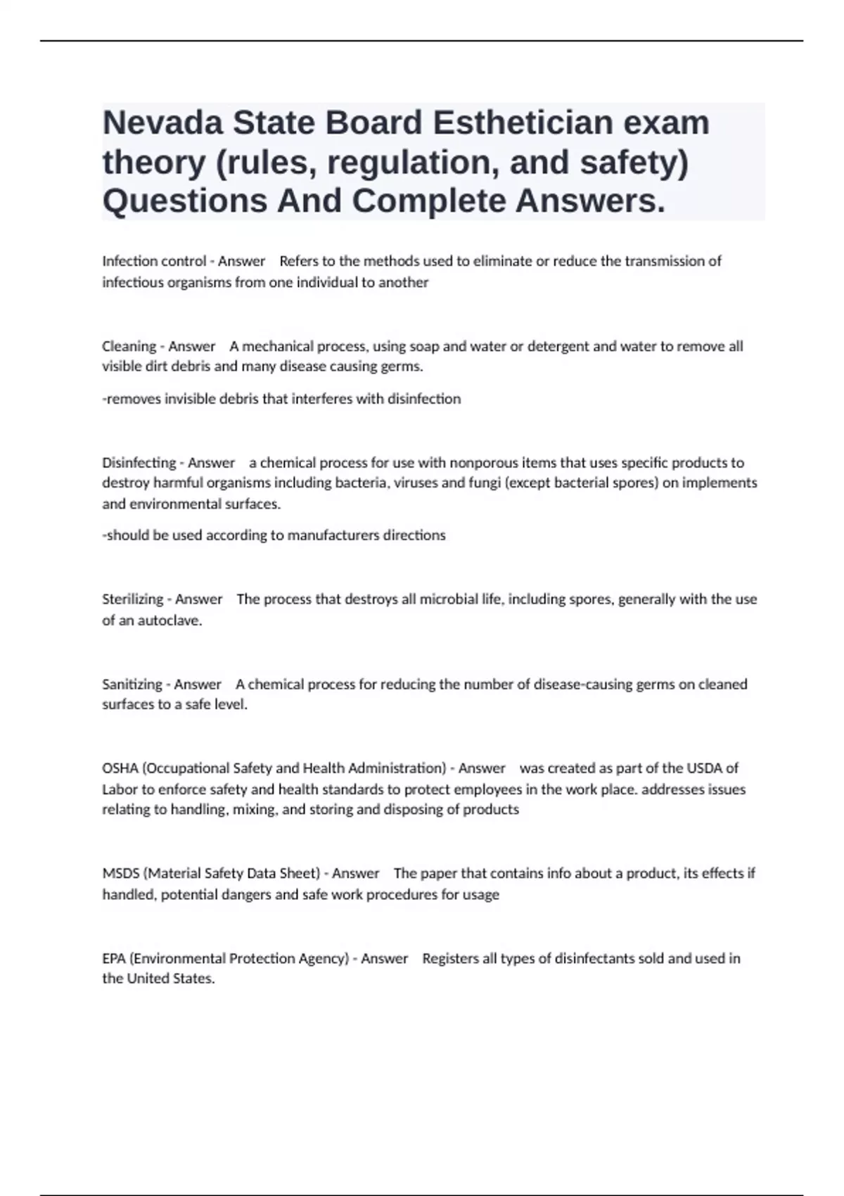 Infection control - Answer Refers to the methods used to eliminate or reduce the transmission of infectious organisms from one individual to another Cleaning - Answer A mechanical process, using soap and water or detergent and water to remove all visible dirt debris and many disease causing germs. -removes invisible debris that interferes with disinfection Disinfecting - Answer a chemical process for use with nonporous items that uses specific products to destroy harmful organisms including bacteria, viruses and fungi (except bacterial spores) on implements and environmental surfaces. -should be used according to manufacturers directions Sterilizing - Answer The process that destroys all microbial life, including spores, generally with the use of an autoclave. Sanitizing - Answer A chemical process for reducing the number of disease-causing germs on cleaned surfaces to a safe level. OSHA (Occupational Safety and Health Administration) - Answer was created as part of the USDA of Labor to enforce safety and health standards to protect employees in the work place. addresses issues relating to handling, mixing, and storing and disposing of products MSDS (Material Safety Data Sheet) - Answer The paper that contains info about a product, its effects if handled, potential dangers and safe work procedures for usage EPA (Environmental Protection Agency) - Answer Registers all types of disinfectants sold and used in the United States.
