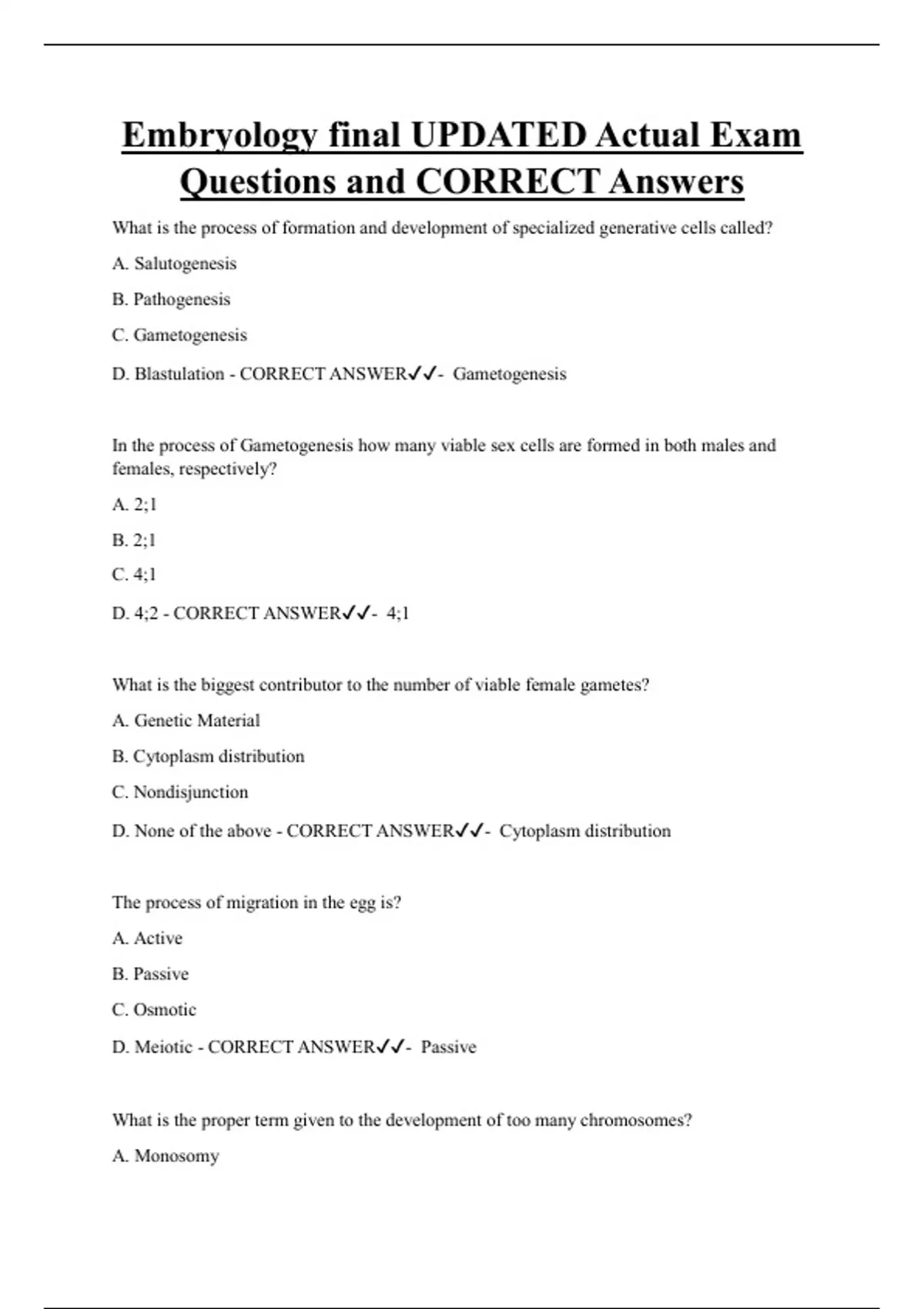 Embryology final UPDATED Actual Exam Questions and CORRECT Answers What is the process of formation and development of specialized generative cells called? A. Salutogenesis B. Pathogenesis C. Gametogenesis D. Blastulation - CORRECT ANSWER- Gametogenesis In the process of Gametogenesis how many viable sex cells are formed in both males and females, respectively? A. 2;1 B. 2;1 C. 4;1 D. 4;2 - CORRECT ANSWER- 4;1
