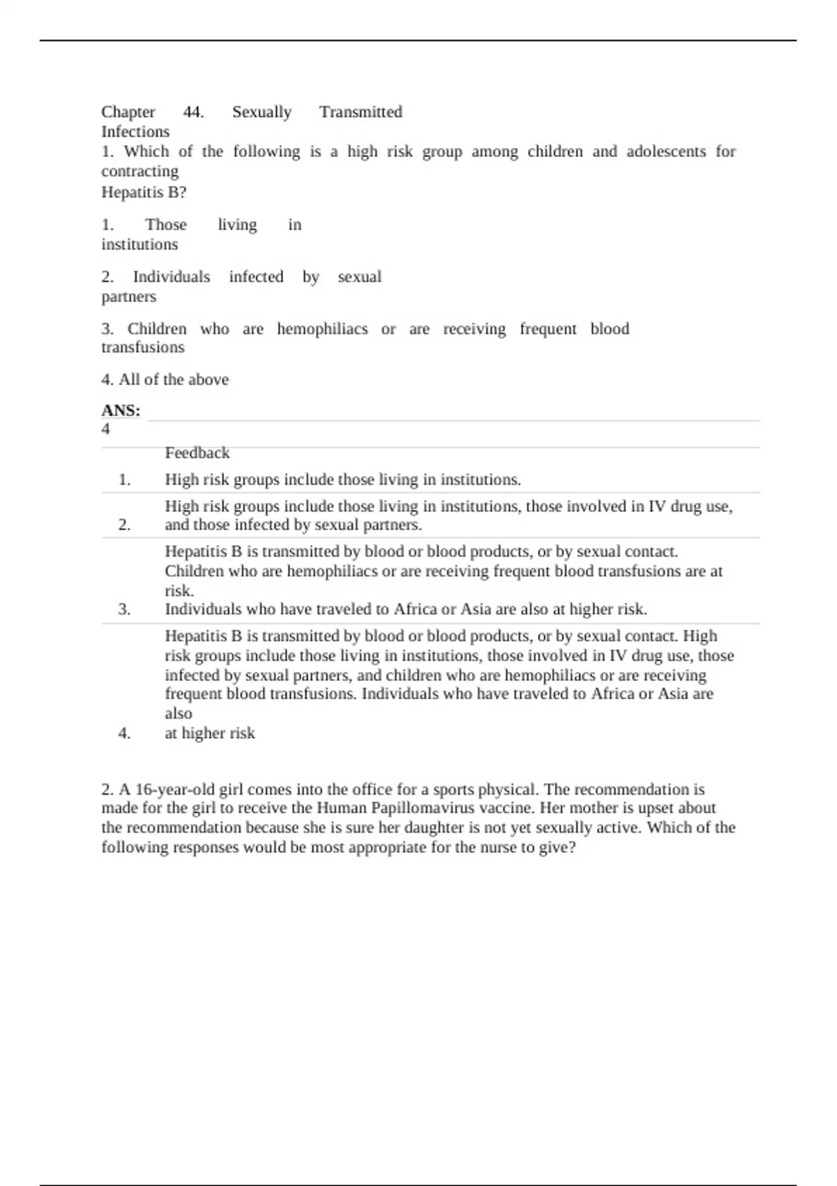 2. A 16-year-old girl comes into the office for a sports physical. The recommendation is