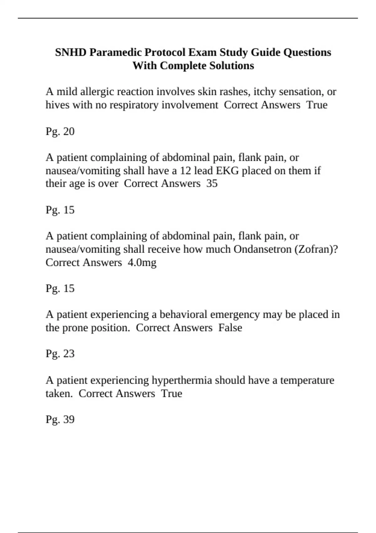 SNHD Paramedic Protocol Exam Study Guide Questions With Complete Solutions