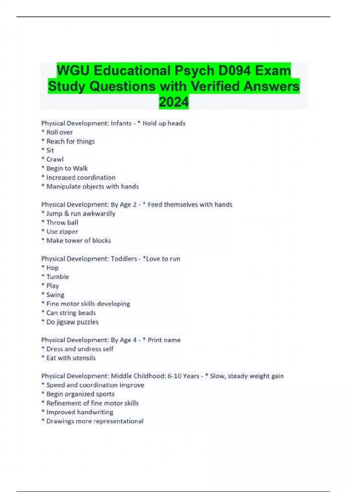 Physical Development: Infants - * Hold up heads * Roll over * Reach for things * Sit * Crawl * Begin to Walk * Increased coordination * Manipulate objects with hands Physical Development: By Age 2 - * Feed themselves with hands * Jump & run awkwardly * Throw ball * Use zipper * Make tower of blocks Physical Development: Toddlers - *Love to run * Hop * Tumble * Play * Swing * Fine motor skills developing * Can string beads * Do jigsaw puzzles Physical Development: By Age 4 - * Print name * Dress and undress self * Eat with utensils Physical Development: Middle Childhood: 6-10 Years - * Slow, steady weight gain * Speed and coordination improve * Begin organized sports * Refinement of fine motor skills * Improved handwriting * Drawings more representational Physical Development: Adolescence: 10-18 Years - * Girls begin puberty earlier * Boys grow taller * Boys more muscular * Girls' physical growth slows * Boys physical growth continues * Reach sexual maturity At which developmental stage would a child be expected to tie shoes? - Primary school How does female growth differ than male growth during the adolescent stage? - Females usually complete physical growth before males Which characteristic is consistent with a student in the early childhood physical development stage? - Ties shoelaces Which characteristic is consistent with a student in the middle childhood physical development stage? - Refining of motor coordination Piaget - * scheme, schema * adaptation * assimilation, disequilibrium, equilibrium, & accommodation * Learn from interaction with peers and environment Vygotsky - * Scaffolding * Zone of Proximal Development (ZPD) * More knowledgeable other (MKO) * Using language (as a mediator) ** explaining, giving examples, asking leading questions * Social & Cultural interactions important Piaget Stages - * Sensorimotor Stage * Preoperational Stage * Concrete Operational Stage * Formal Operational Stage Sensorimotor Stage - (Birth - 2 years) * Learn through movement and senses * Reflexive or active * Sucking