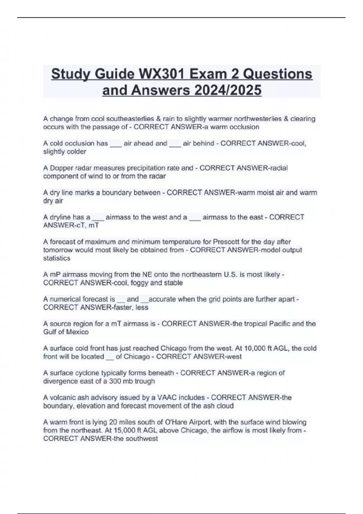 Study Guide WX301 Exam 2 Questions and Answers 2024/2025