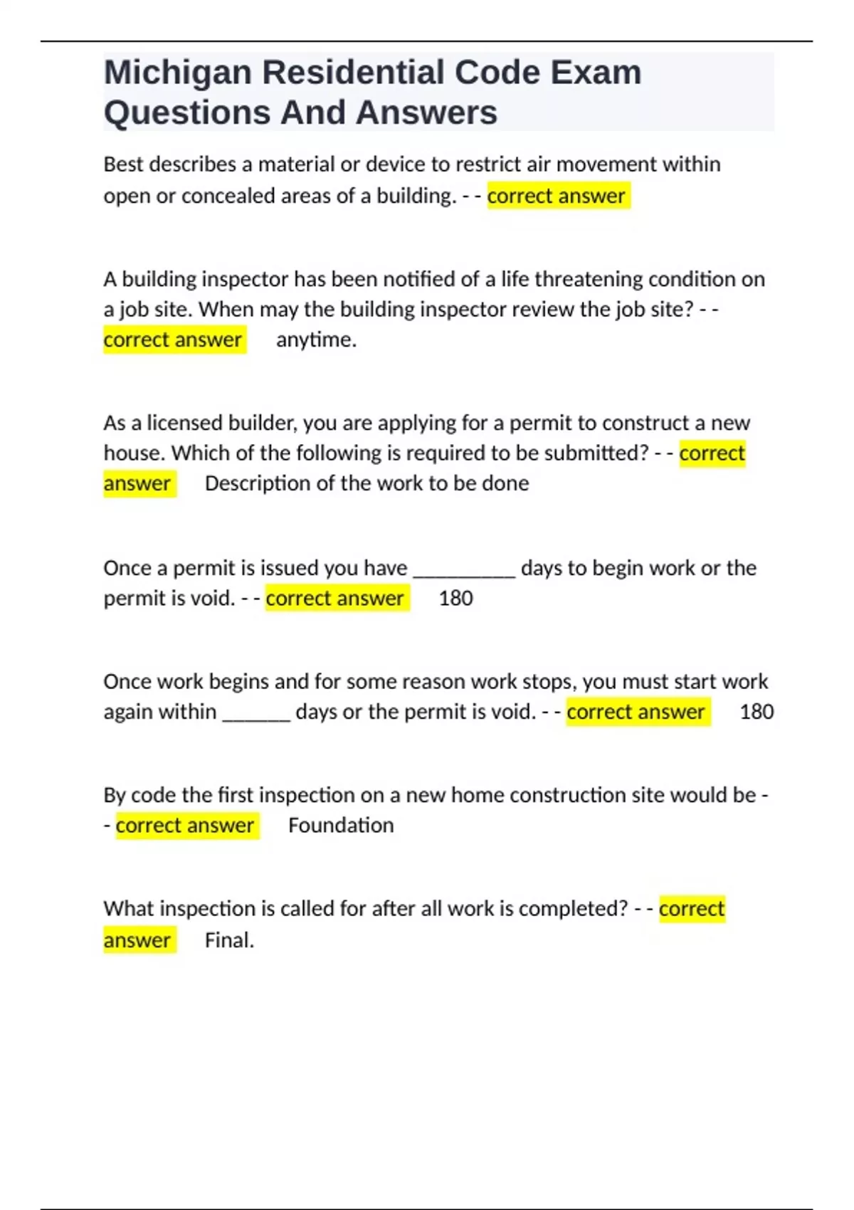 , Michigan Residential Code Exam