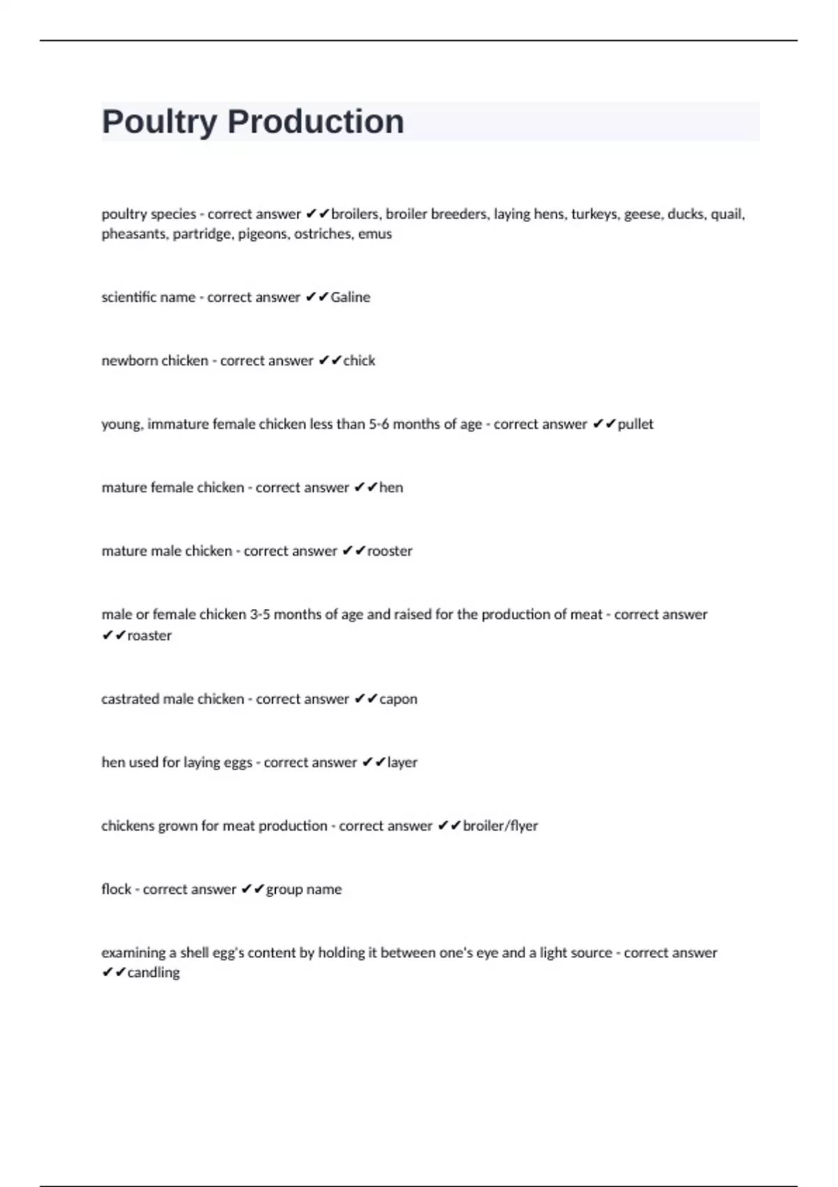 poultry species - correct answer ✔✔broilers, broiler breeders, laying hens, turkeys, geese, ducks, quail,