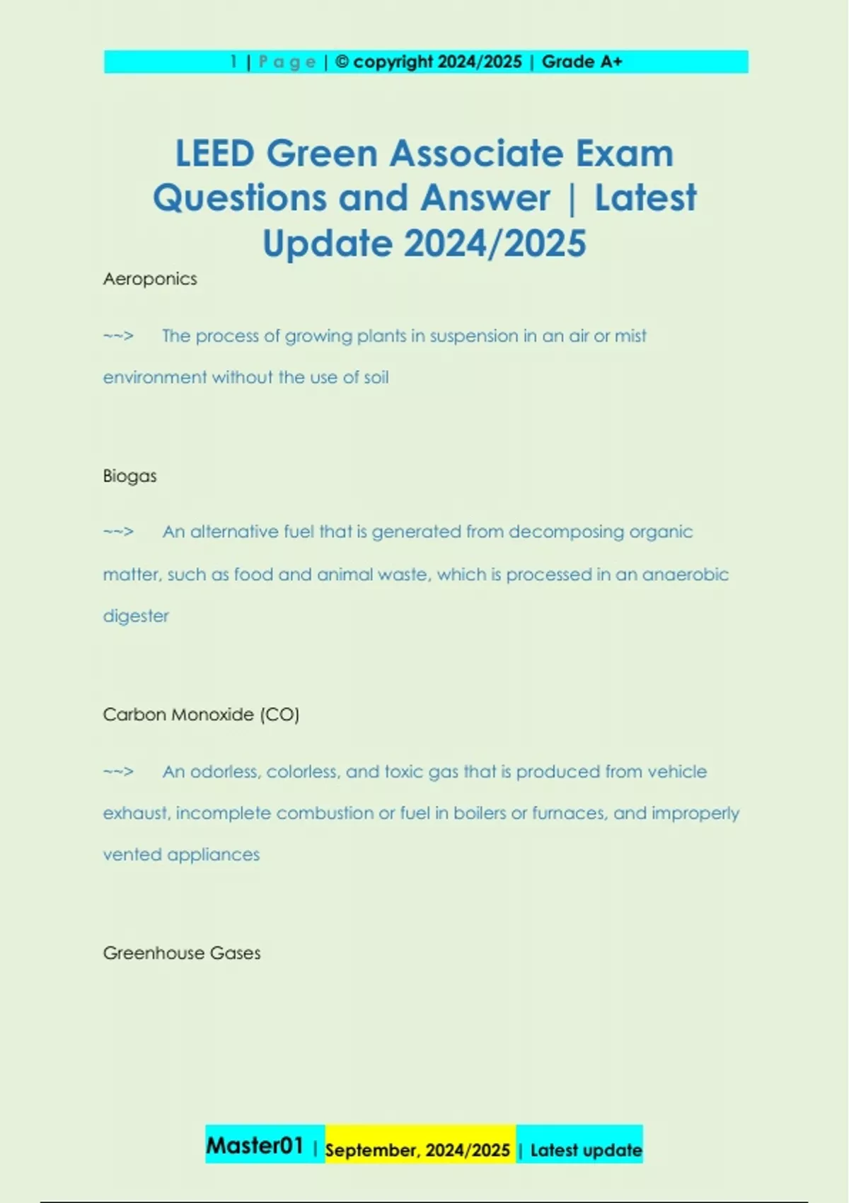 Aeroponics ~~> The process of growing plants in suspension in an air or mist environment without the use of soil Biogas ~~> An alternative fuel that is generated from decomposing organic matter, such as food and animal waste, which is processed in an anaerobic digester Carbon Monoxide (CO) ~~> An odorless, colorless, and toxic gas that is produced from vehicle exhaust, incomplete combustion or fuel in boilers or furnaces, and improperly vented appliances Greenhouse Gases 2 | P a g e | © copyright 2024/2025 | Grade A+ Master01 | September, 2024/2025 | Latest update ~~> Gases that trap heat in the atmosphere The most abundant of the greenhouse gases, carbon dioxide, is released through the burning of fossil fuels and the manufacturing of cement LEED ~~> Leadership in Energy and Environmental Design The USGBC LEED green building program is the preeminent program for the design, construction, maintenance, and operation of high-performance green buildings | Third-party green building certification program and the globally recognized standard for the design, construction and operation of high-performance green buildings and neighborhoods. Lean Process Improvement ~~> The principle of continuously improving any process through the elimination of waste in every step of manufacturing LEED AP ~~> The advanced level of LEED credentials that requires an advanced knowledge in green building as well as expertise in a particular LEED rating system 3 | P a g e | © copyright 2024/2025 | Grade A+ Master01 | September, 2024/2025 | Latest update LEED Green Associate ~~> The basic level of LEED credentials that requires a documented, up-todate understanding of the most current green building principles and practices Sulfur Dioxide (SO2) ~~> A highly reactive gas that is primarily produced through the combustion of fossil fuels a