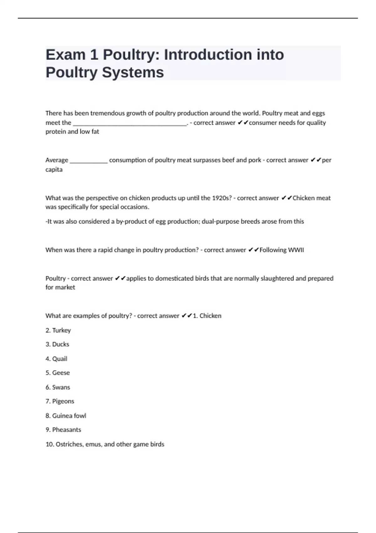 What are examples of poultry? - correct answer ✔✔1. Chicken