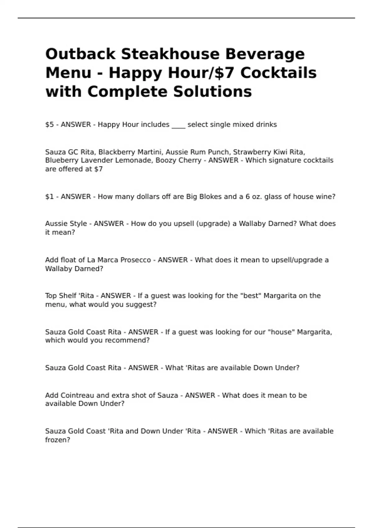 Outback Steakhouse Beverage Menu - Happy Hour/$7 Cocktails with Complete SolutionsOutback Steakhouse Beverage Menu - Happy Hour/$7 Cocktails with Complete SolutionsOutback Steakhouse Beverage Menu - Happy Hour/$7 Cocktails with Complete Solutions$5 - ANSWER - Happy Hour includes ____ select single mixed drinks Sauza GC Rita, Blackberry Martini, Aussie Rum Punch, Strawberry Kiwi Rita, Blueberry Lavender Lemonade, Boozy Cherry - ANSWER - Which signature cocktails are offered at $7 $1 - ANSWER - How many dollars off are Big Blokes and a 6 oz. glass of house wine?