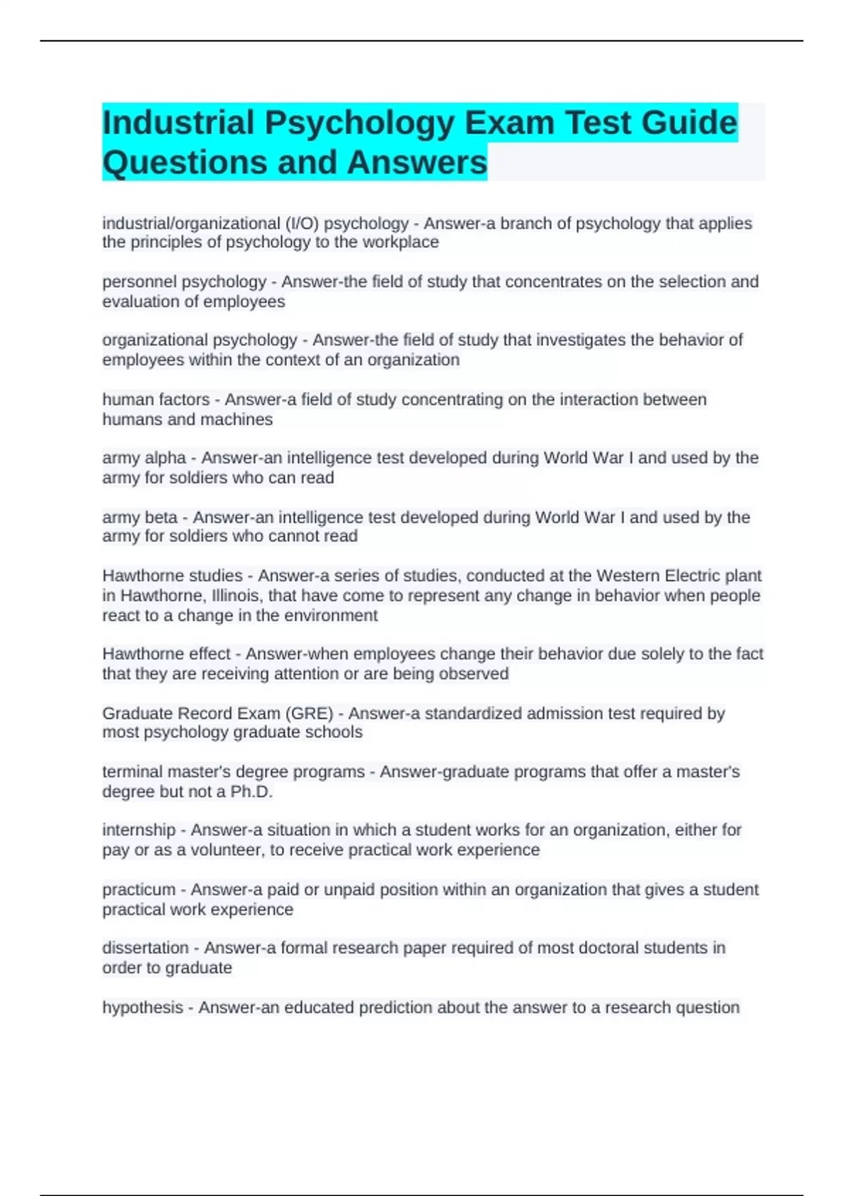 industrial/organizational (I/O) psychology - Answer-a branch of psychology that applies