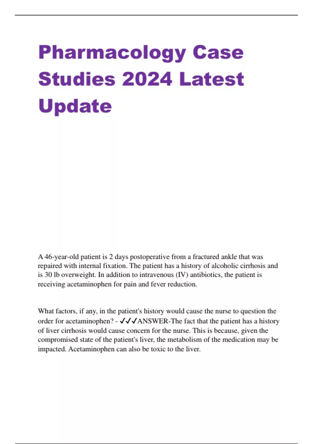 Pharmacology Case Studies 2024 Latest Update A 46-year-old patient is 2 days postoperative from a fractured ankle that was repaired with internal fixation. The patient has a history of alcoholic cirrhosis and is 30 lb overweight. In addition to intravenous (IV) antibiotics, the patient is receiving acetaminophen for pain and fever reduction. What factors, if any, in the patient's history would cause the nurse to question the order for acetaminophen? - ANSWER-The fact that the patient has a history of liver cirrhosis would cause concern for the nurse. This is because, given the compromised state of the patient's liver, the metabolism of the medication may be impacted. Acetaminophen can also be toxic to the liver.