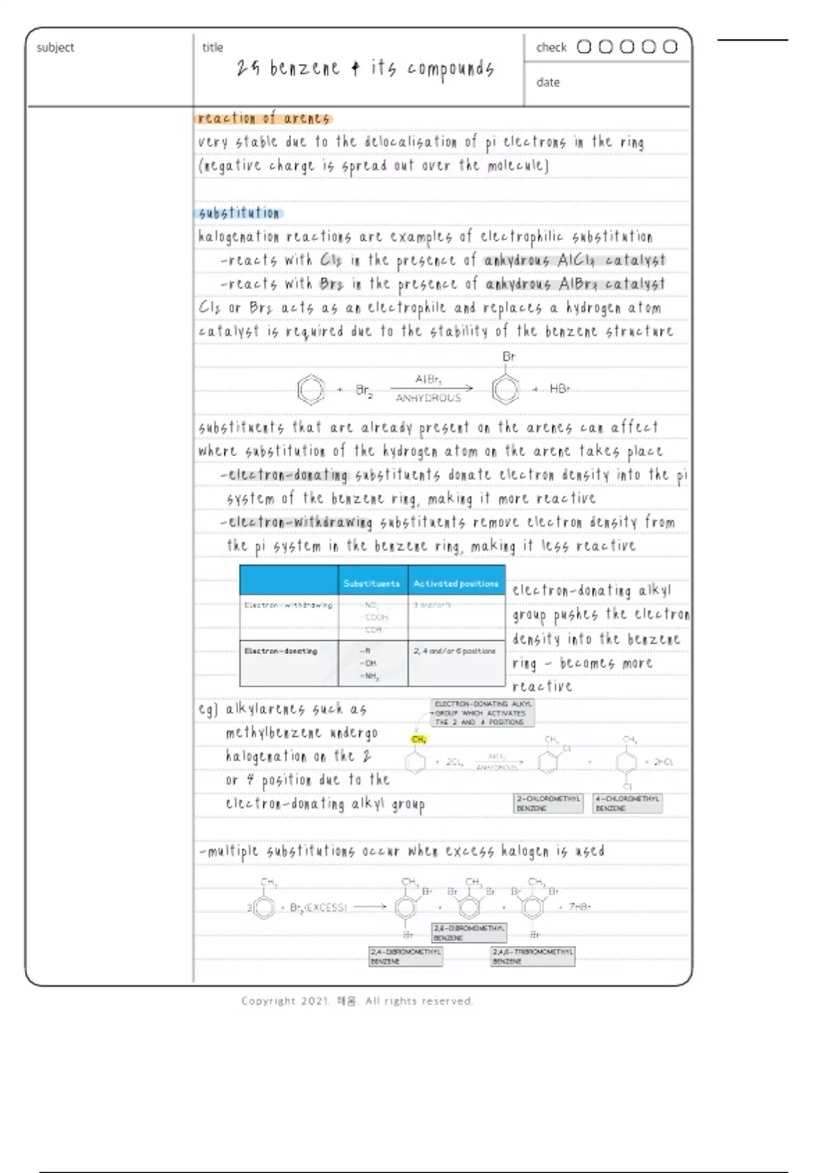 A Level Chemistry Chapter 25 Benzene and its compounds Detailed Summary Note including the topics - reaction of arenes, Friedel-Crafts reactions, aromatic stabilisation, reactivity of halogenoalkanes and halogenoarenes, phenols, and relative acidities