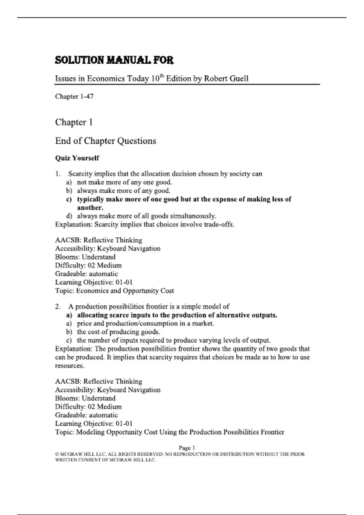 Solution Manual for Issues in Economics Today 10th Edition by Robert Guell. Chapter 1: Economics: The Study of Opportunity Cost Chapter 2: Supply and Demand Chapter 3: The Concept of Elasticity and Consumer and Producer Surplus Chapter 4: Firm Production, Cost, and Revenue Chapter 5: Perfect Competition, Monopoly, and Economic versus Normal Profit Chapter 6: Every Macroeconomic Word You Ever Heard: Gross Domestic Product, Inflation, Unemployment, Recession, and Depression Chapter 7: Money, Interest Rates, and Present Value Chapter 8: Aggregate Demand and Aggregate Supply Chapter 9: Fiscal Policy Chapter 10: Monetary Policy Chapter 11: Federal Spending Chapter 12: Federal Deficits, Surpluses, and the National Debt Chapter 13: The Great Recession Chapter 14: The COVID-19 Recession Chapter 15: Is Economic Stagnation the New Normal? Chapter 16: Is the (Fiscal) Sky Falling?: An Examination of Unfunded Social Security, Medicare, and State and Local Pension Liabilities Chapter 17: International Trade: Does It Jeopardize American Jobs Chapter 18: International Finance and Exchange Rates Chapter 19: The European Union, Debt Crisis, and Brexit Chapter 20: Economic Growth and Development Chapter 21: Are Trade Agreements Good for Us? Chapter 22: The Economics of Terrorism Chapter 23: The Line between Legal and Illegal Goods Chapter 24: Natural Resources, the Environment, and Climate Change Chapter 25: So You Want to Be a Lawyer: Economics and the Law Chapter 26: The Economics of Crime Chapter 27: Antitrust Chapter 28: Health Care Chapter 29: Government-Provided Health Insurance: Medicaid, Medicare, and the Children’s Health Insurance Program Chapter 30: The Economics of Prescription Drugs and Vaccines Chapter 31: The Economics of K–12 Education Chapter 32: College Education: Why Is It So Expensive? Chapter 33: The Economics of Sex, Race, and Ethnic Discrimination Chapter 34: Income and Wealth Inequality: What’s Fair? Chapter 35: Farm Policy Chapter 36: Minimum Wage Chapter 37: Rent Control Chapter 38: Poverty and Welfare Chapter 39: Head Start Chapter 40: Social Security Chapter 41: Personal Income Taxes Chapter 42: Energy Prices Chapter 43: If We Build It, Will They Come? And Other Sports Questions Chapter 44: The Stock Market and Crashes Chapter 45: Unions Chapter 46: The Economics of Big Retail: Walmart and Amazon Chapter 47: The Economic Impact of Casino and Sports Gambling