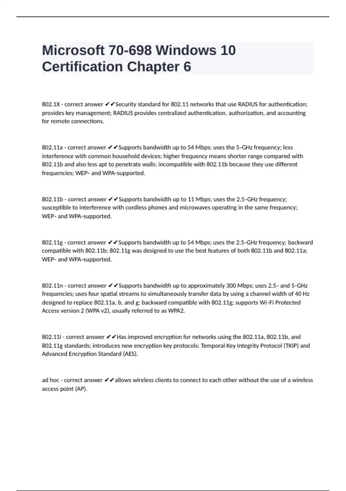 802.11n - correct answer ✔✔Supports bandwidth up to approximately 300 Mbps; uses 2.5‐ and 5‐GHz