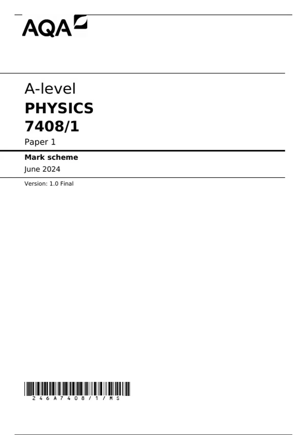 , MARK SCHEME – A-LEVEL PHYSICS – 7408/1 – JUNE