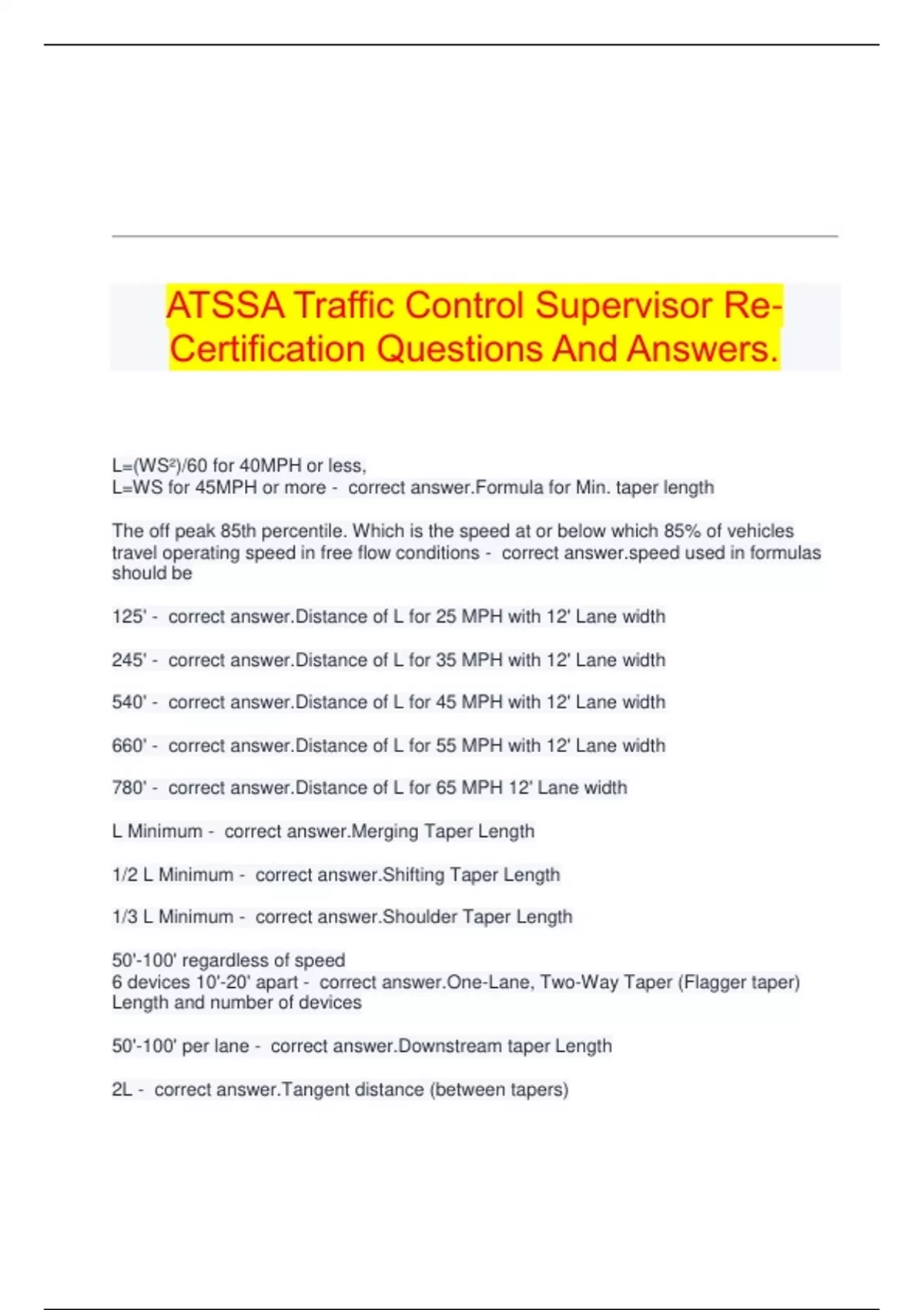 L=WS for 45MPH or more - correct answer.Formula for Min. taper length