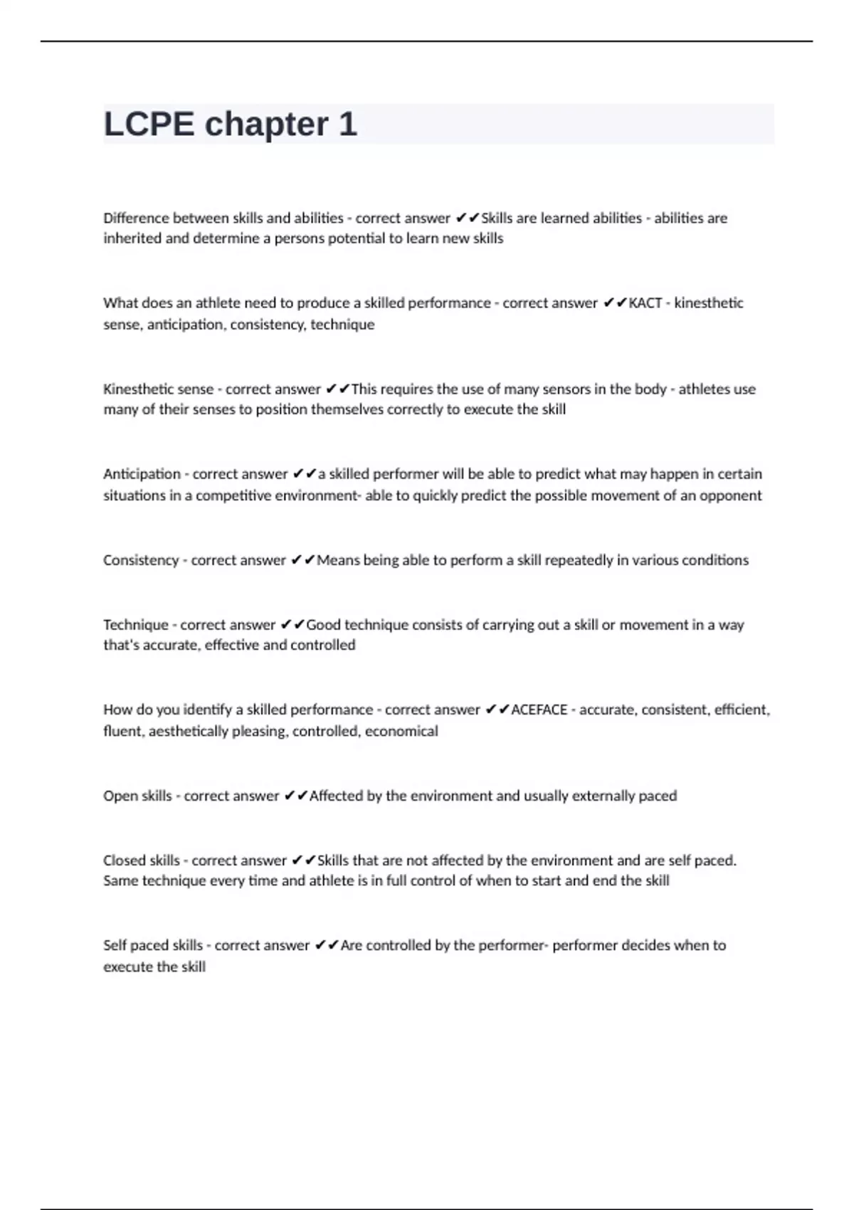 What does an athlete need to produce a skilled performance - correct answer ✔✔KACT - kinesthetic