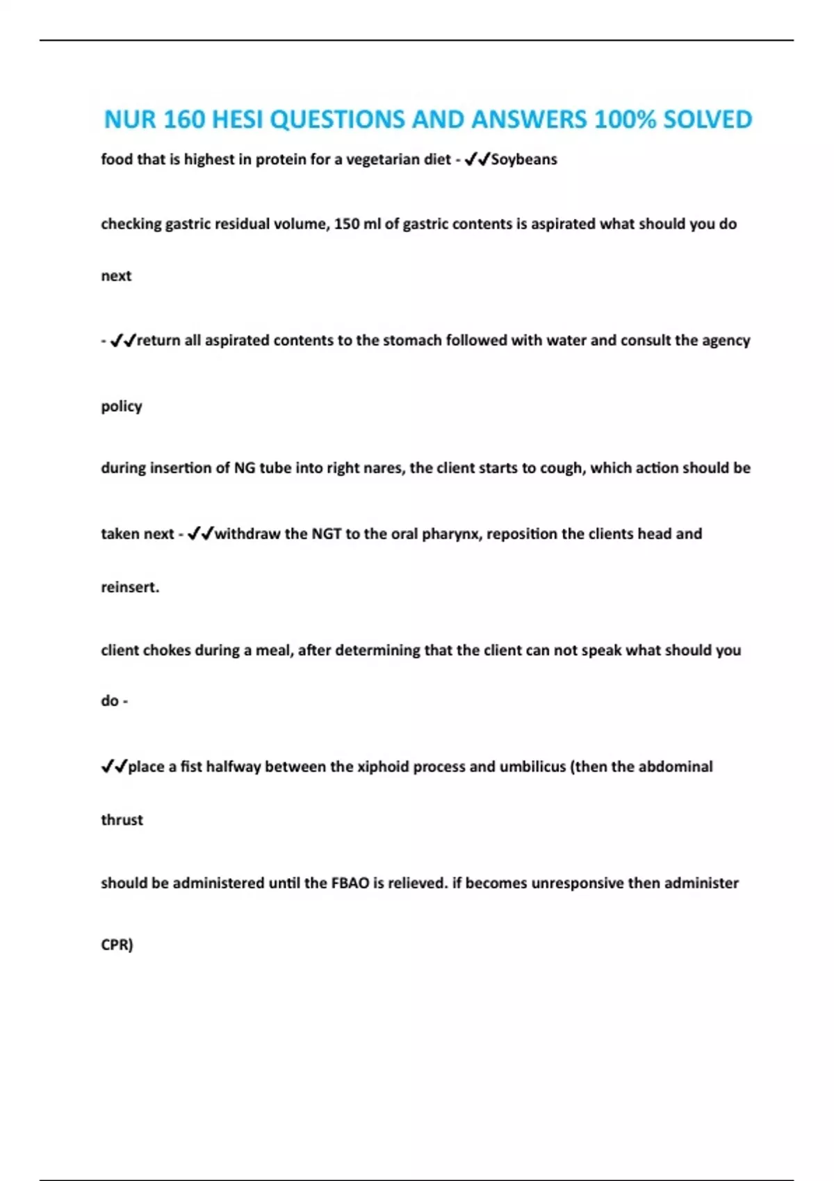 NUR 160 HESI QUESTIONS AND ANSWERS 100% SOLVED