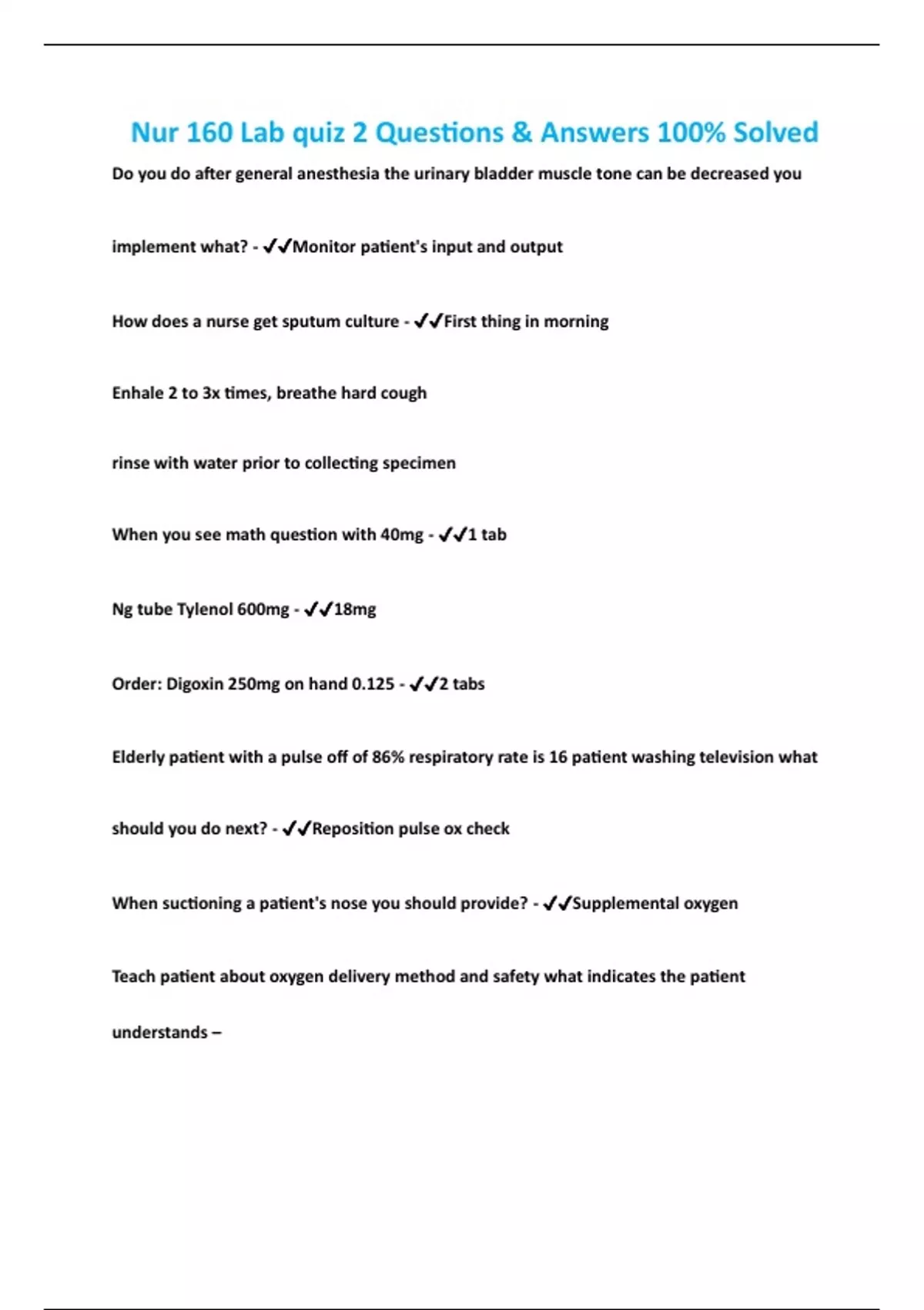 Nur 160 Lab quiz 2 Questions & Answers 100% Solved