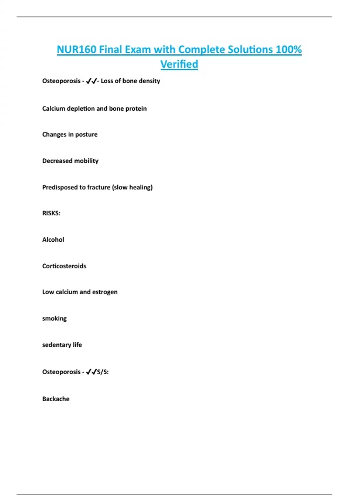 NUR160 Final Exam with Complete Solutions 100% Verified