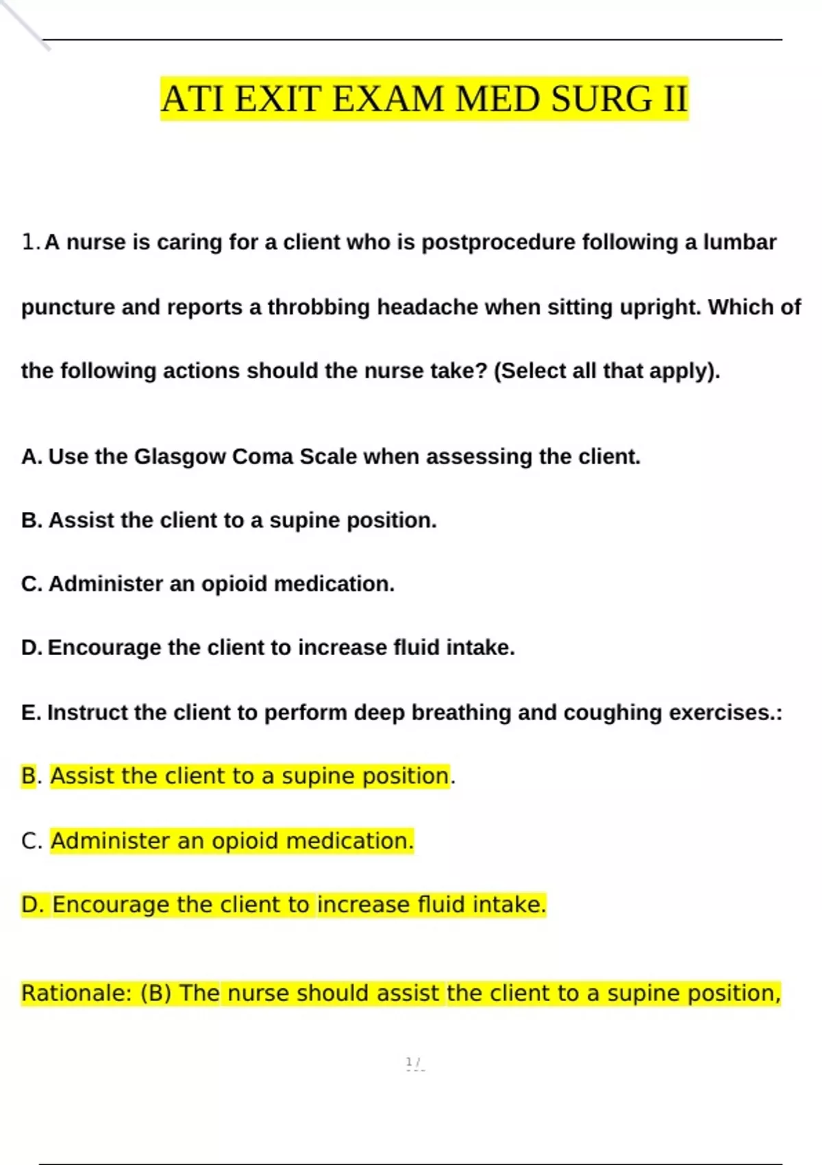 1.A nurse is caring for a client who is postprocedure following a lumbar