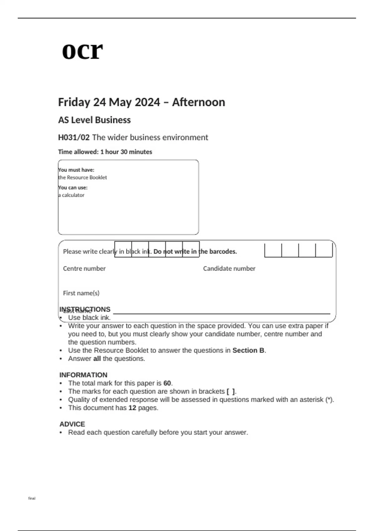 ocr AS Level Business (H031-02) Question Paper May2024.