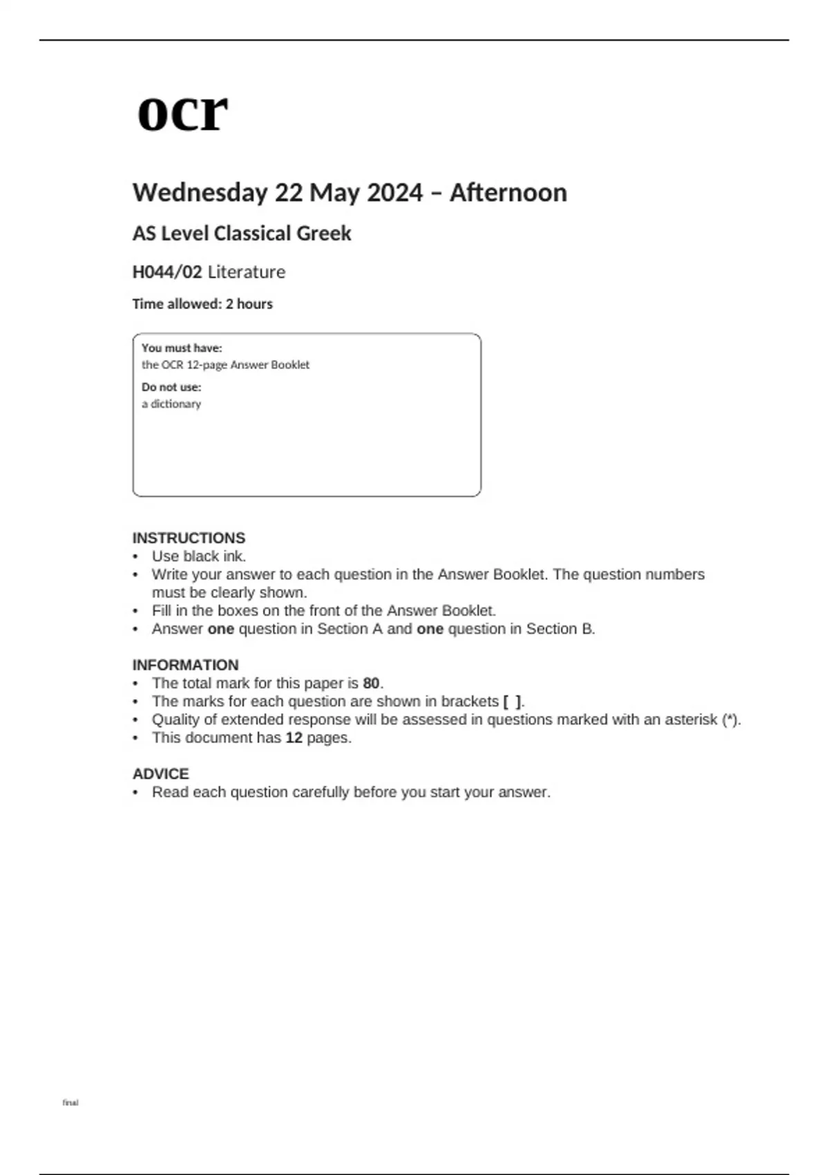 ocr AS Level Classical Greek (H044-02) Question Paper May2024.