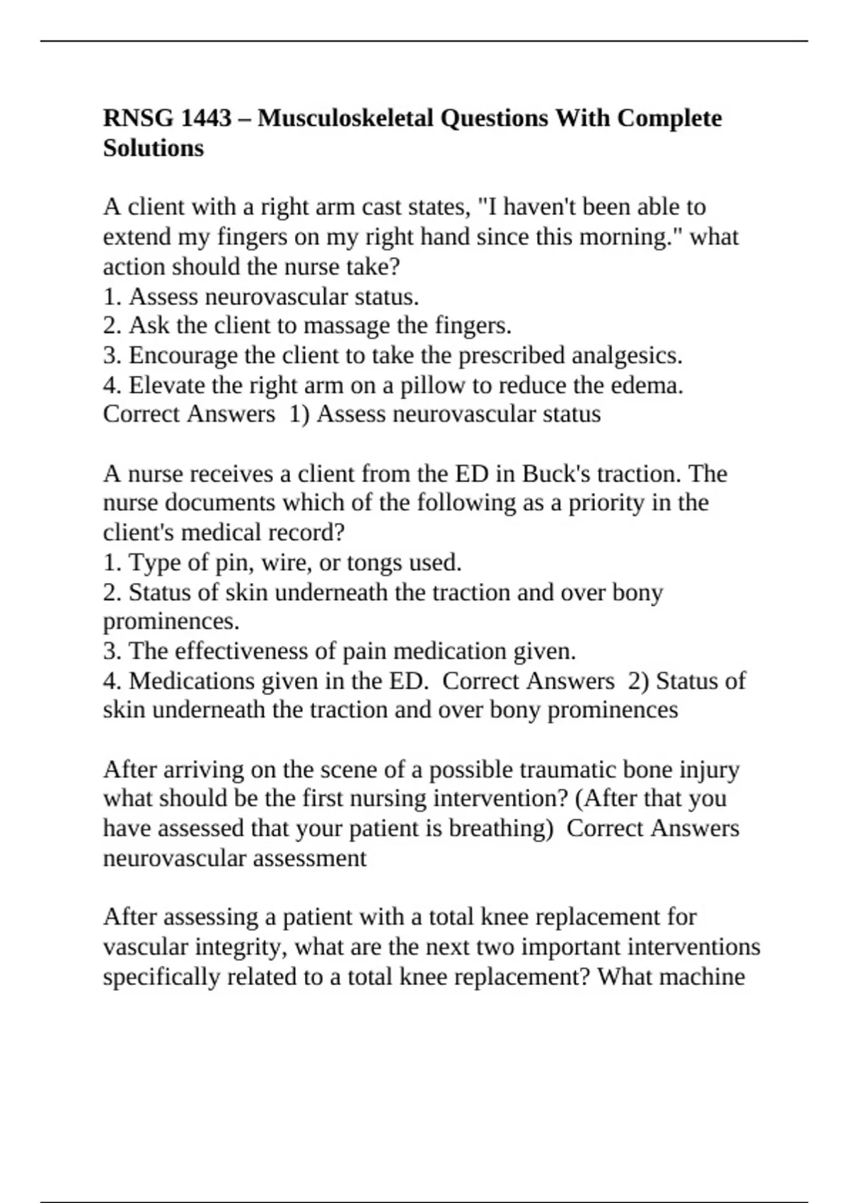 Correct Answers 1) Assess neurovascular status