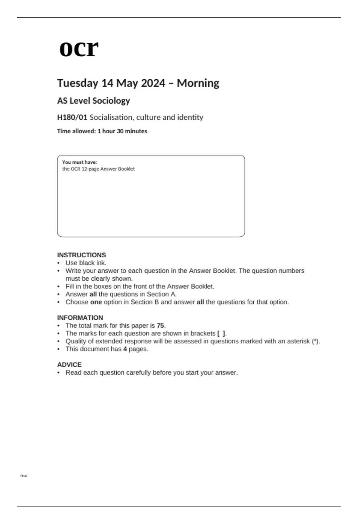 ocr AS Level Sociology (H180-01) Question Paper May2024.