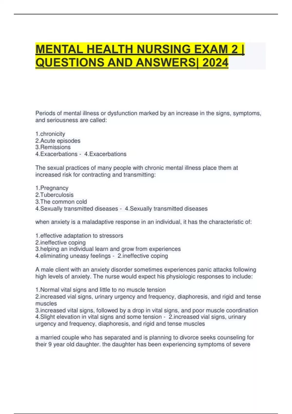 MENTAL HEALTH NURSING EXAM 2 | QUESTIONS AND ANSWERS| 2024 Periods of mental illness or dysfunction marked by an increase in the signs, symptoms, and seriousness are called: icity 2.Acute episodes 3.Remissions 4.Exacerbations - 4.Exacerbations The sexual practices of many people with chronic mental illness place them at increased risk for contracting and transmitting: 1.Pregnancy 2.Tuberculosis 3.The common cold 4.Sexually transmitted diseases - 4.Sexually transmitted diseases when anxiety is a maladaptive response in an individual, it has the characteristic of: tive adaptation to stressors ective coping ng an individual learn and grow from experiences nating uneasy feelings - ective coping
