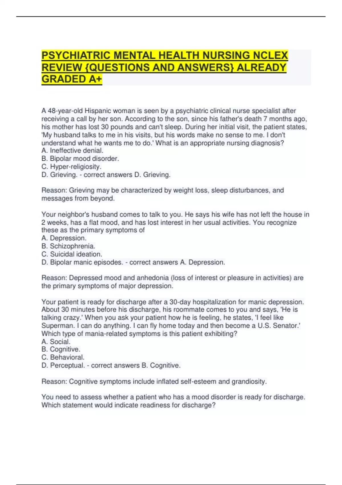 PSYCHIATRIC MENTAL HEALTH NURSING NCLEX REVIEW {QUESTIONS AND ANSWERS} ALREADY GRADED A+ A 48-year-old Hispanic woman is seen by a psychiatric clinical nurse specialist after receiving a call by her son. According to the son, since his father's death 7 months ago, his mother has lost 30 pounds and can't sleep. During her initial visit, the patient states, 'My husband talks to me in his visits, but his words make no sense to me. I don't understand what he wants me to do.' What is an appropriate nursing diagnosis? A. Ineffective denial. B. Bipolar mood disorder. C. Hyper-religiosity. D. Grieving. - correct answers D. Grieving. Reason: Grieving may be characterized by weight loss, sleep disturbances, and messages from beyond. Your neighbor's husband comes to talk to you. He says his wife has not left the house in 2 weeks, has a flat mood, and has lost interest in her usual activities. You recognize these as the primary symptoms of A. Depression. B. Schizophrenia. C. Suicidal ideation. D. Bipolar manic episodes. - correct answers A. Depression. Reason: Depressed mood and anhedonia (loss of interest or pleasure in activities) are the primary symptoms of major depression.