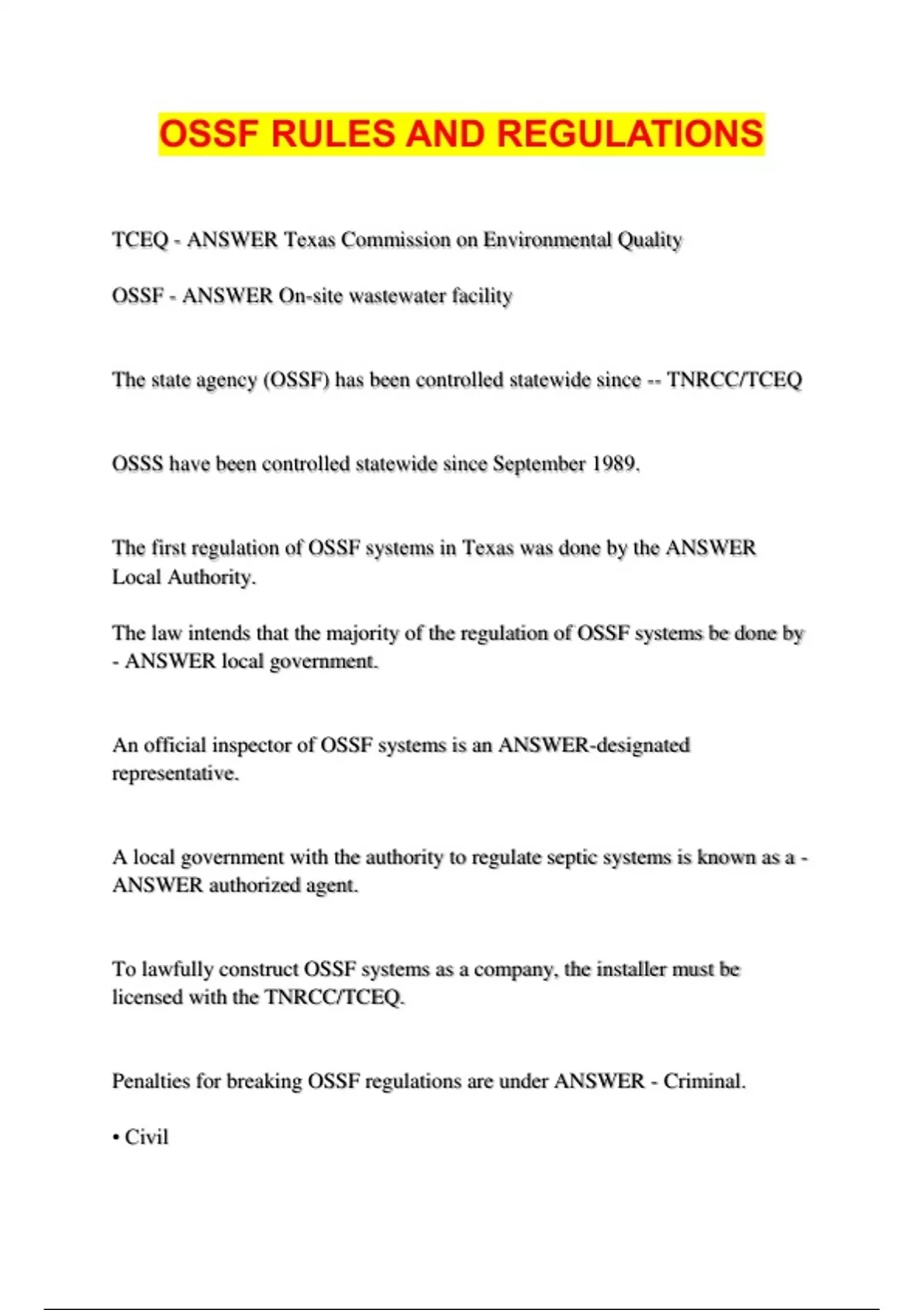 The first regulation of OSSF systems in Texas was done by the ANSWER